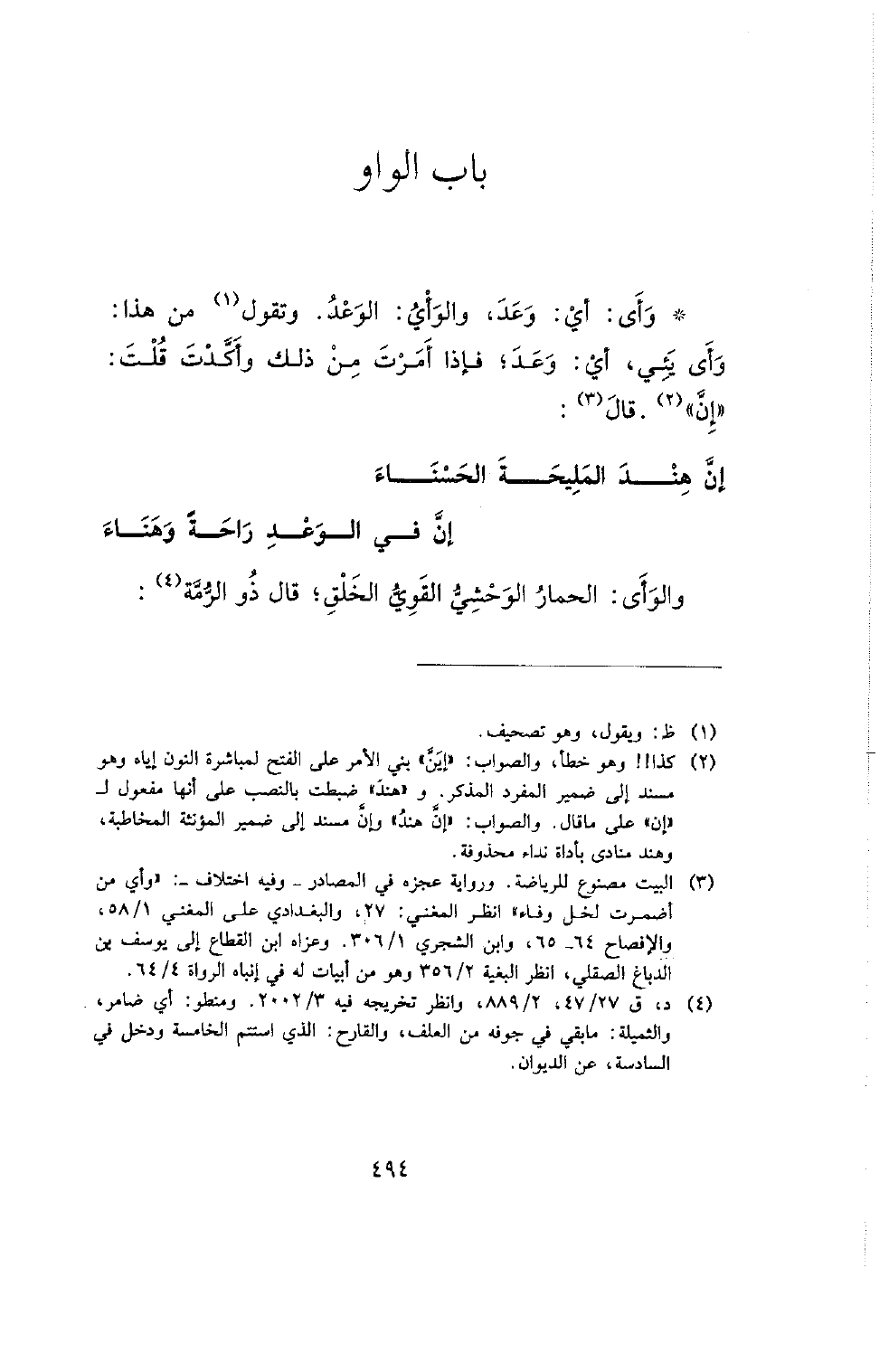 * وأى: أي: وعد، والوأي: الوعد. وتقول من هذا: وأى يئي، أي: وعد؛ فإذا أمرت من ذلك وأكدت قلت: (إن). قال: