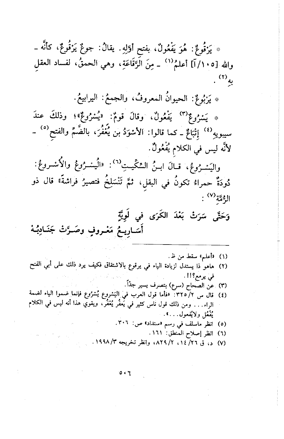 * يسروع يفعول، وقال قوم: (يسروع)؛ وذلك عند سيبويه إتباع- كما قالوا: الأسود بن يعفر، بالضم والفتح- لأنه ليس في الكلام يفعول.