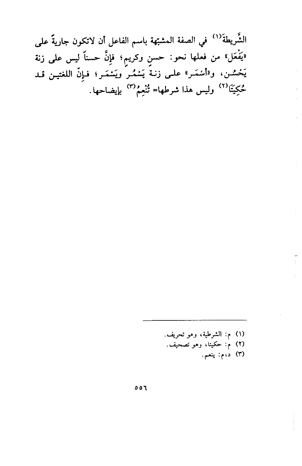 الشريطة في الصفة المشبهة باسم الفاعل أن لا تكون جارية على (يفعل) من فعلها نحو: حسن وكريم؛ فإن حسنا ليس على زنة يحسن، و (أسمر) على زنة يسمر ويسمر؛ فإن اللغتين قد حكيتا وليس هذا شرطها تنعم بإيضاحها.