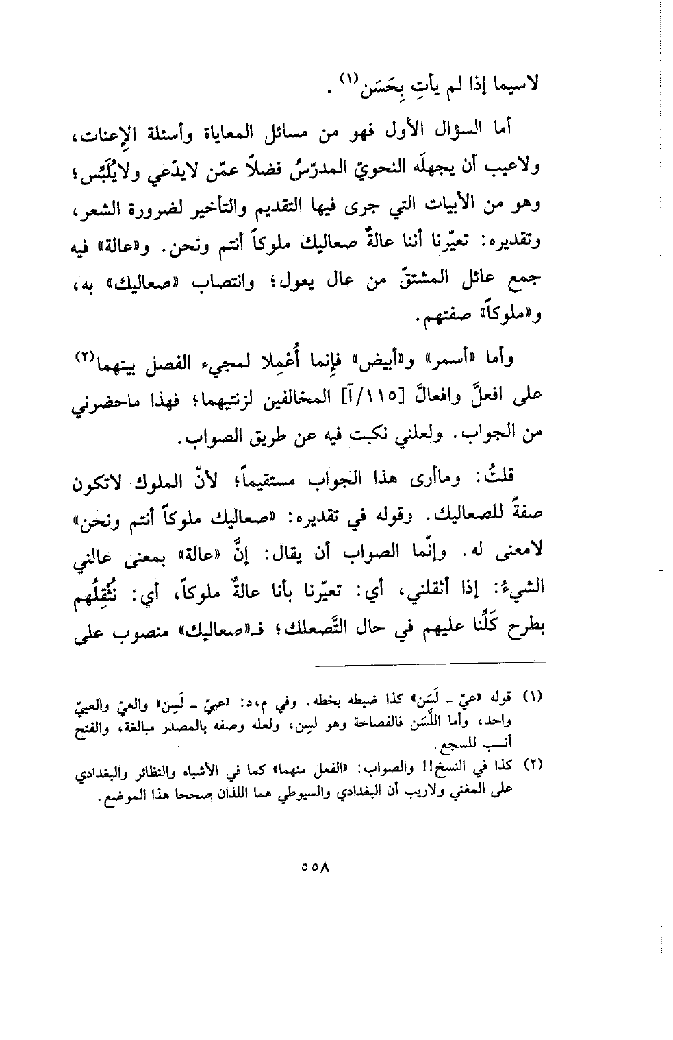 أما السؤال الأول فهو من مسائل المعاياة وأسئلة الإعنات، ولا عيب أن يجهله النحوي المدرس فضلا عمن لا يدعي ولا يلبس؛ وهو من الأبيات التي جرى فيها التقديم والتأخير لضرورة الشعر، وتقديره: تعيرنا أننا عالة صعاليك ملوكا أنتم ونحن. و (عالة) فيه جمع عائل المشتق من عال يعول؛ وانتصاب (صعاليك) به، و (ملوكا) صفتهم.