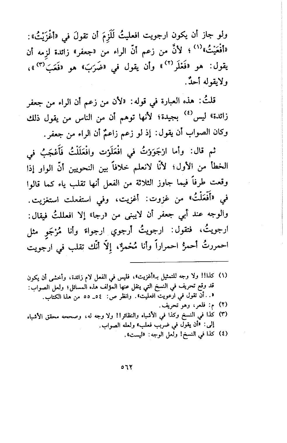 ولو جاز أن يكون ارجويت افعليت للزم أن تقول في (أغزيت): (أفعيت)؛ لأن من زعم ان الراء من (جعفر) زائدة لزمه أن يقول: هو (فعلر) وأن يقول في (ضرب) هو (فعب)، ولا يقوله احد.