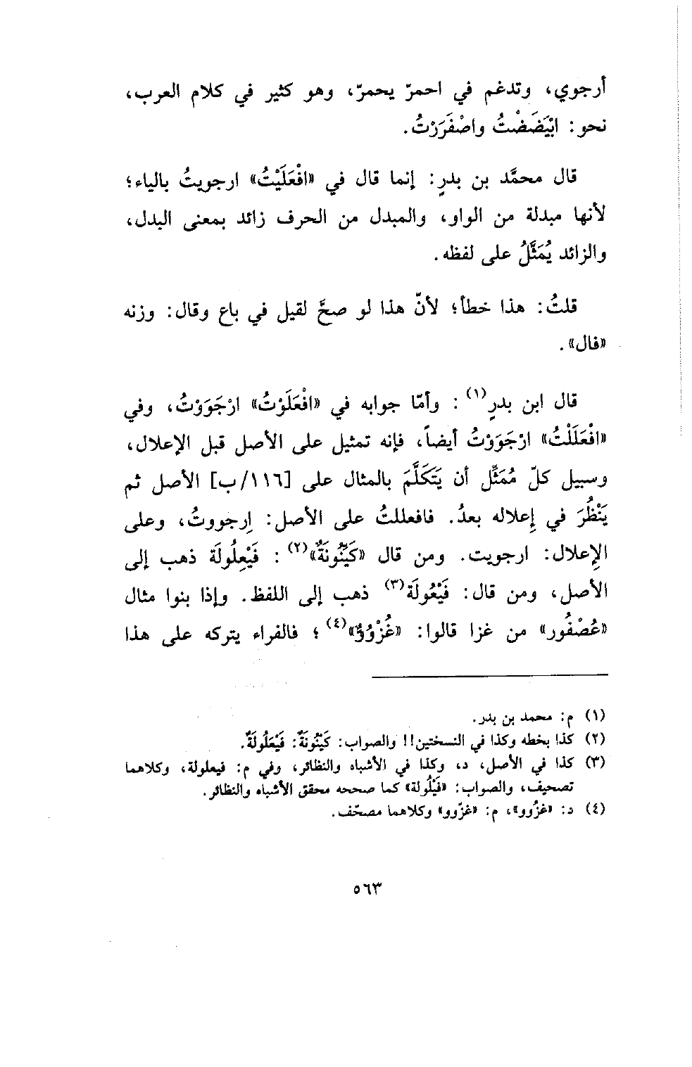 قال ابن بدر: وأما جوابه في (افعلوت) ارجووت، وفي (افعللت) ارجووت أيضا، فإنه تمثيل على الأصل قبل الإعلال، وسبيل كل ممثل أن يتكلم بالمثال على [116/ب] الأصل ثم ينظر في إعلاله بعد. فافعللت على الأصل: ارجووت، وعلى الإعلال: ارجويت. ومن قال (كينونة): فيعلولة ذهب إلى الأصل، ومن قال: فيعولة ذهب إلى اللفظ. وإذا بنوا مثال (عصفور) من غزا قالوا: (غزوو)؛ فالفراء يتركه على هذا