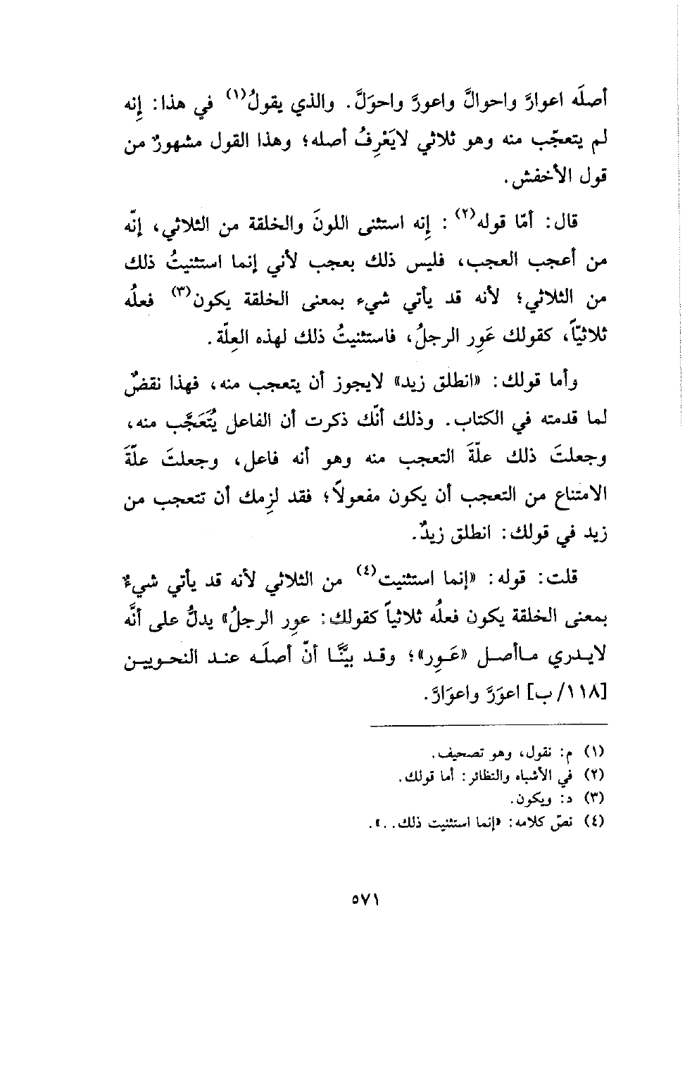 قلت: قوله: (إنما استثنيت من الثلاثي لأنه قد يأتي شيء بمعنى الخلقة يكون فعله ثلاثيا كقولك: عور الرجل) يدل على أنه لا يدري ما أصل (عور)؛ وقد بينا أن أصله عند النحويين [118/ب] اعور واعوار.