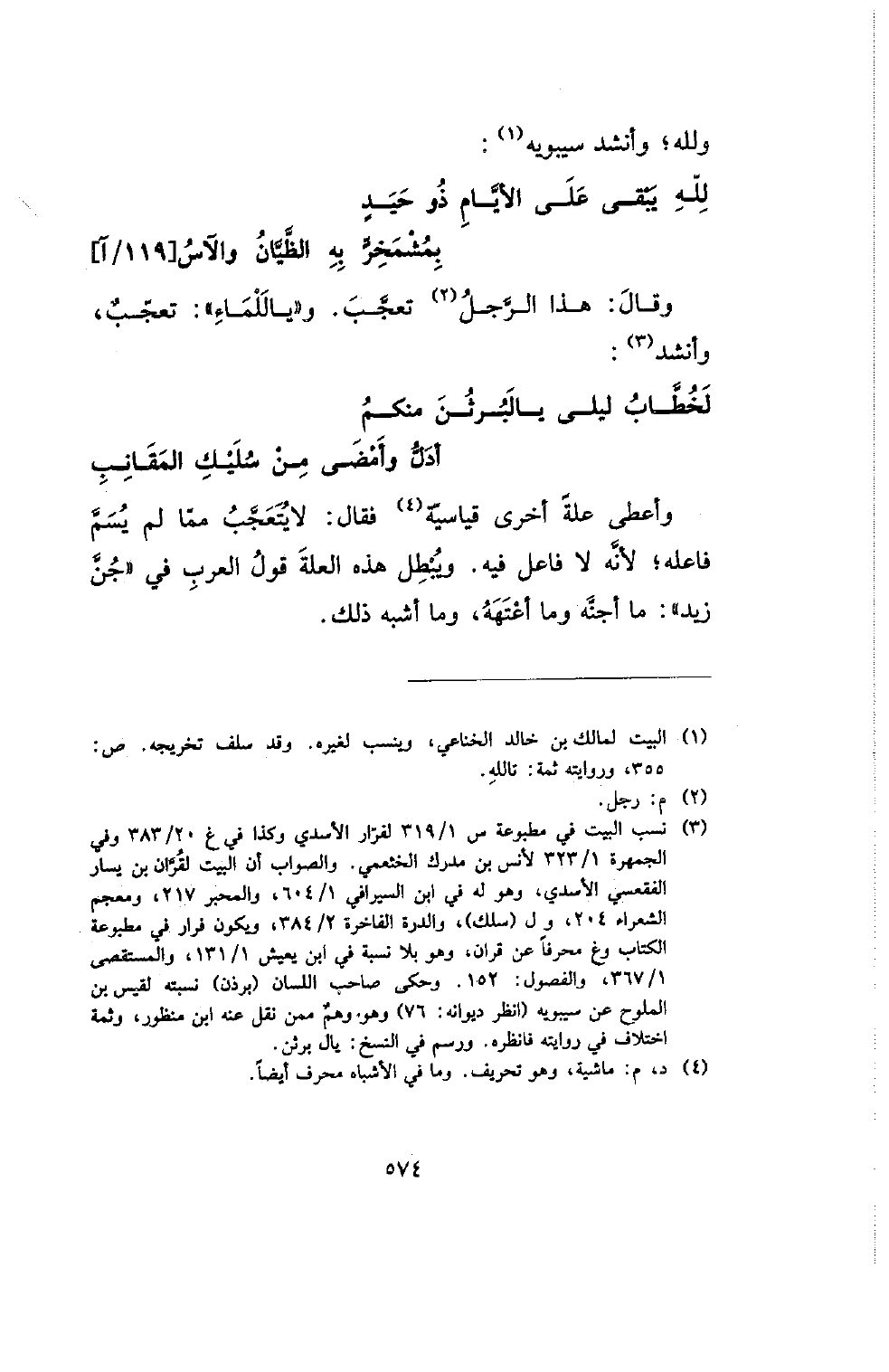 وأعطى علة أخرى قياسية فقال: لا يتعجب مما لم يسم فاعله؛ لأنه لا فاعل فيه. ويبطل هذه العلة قول العرب في (جن زيد): ما أجنه وما أعتهه، وما أشبه ذلك.