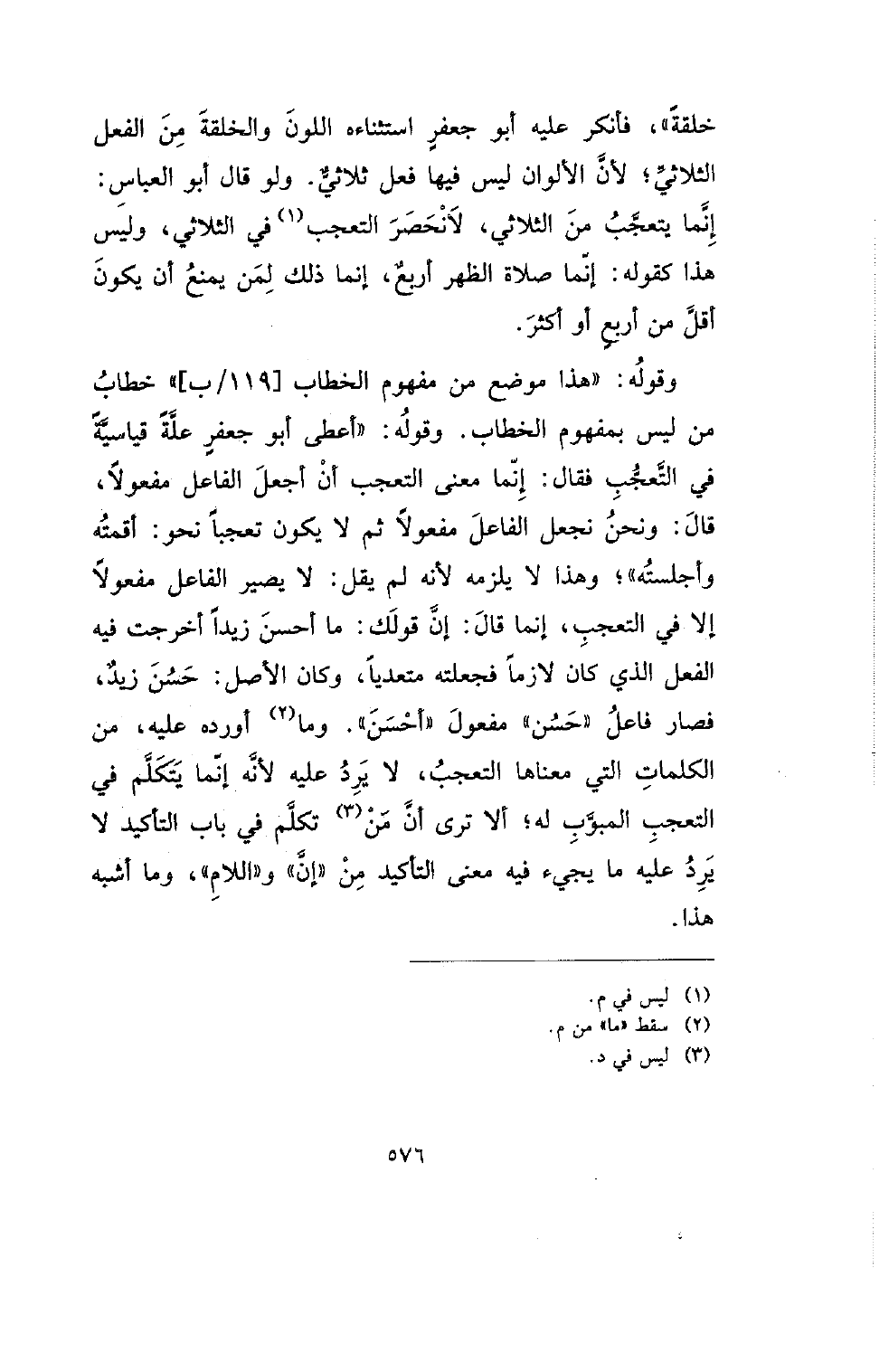 وقوله: (هذا موضع من مفهوم الخطاب [119/ب]) خطاب من ليس بمفهوم الخطاب. وقوله: (أعطى أبو جعفر علة قياسية في التعجب فقال: إنما معنى التعجب أن أجعل الفاعل مفعولا، قال: ونحن نجعل الفاعل مفعولا ثم لا يكون تعجبا نحو: أقمته وأجلسته)؛ وهذا لا يلزمه لأنه لم يقل: لا يصير الفاعل مفعولا إلا في التعجب، إنما قال: إن قولك: ما أحسن زيدا أخرجت فيه الفعل الذي كان لازما فجعلته متعديا، وكان الأصل: حسن زيد، فصار فاعل (حسن) مفعول (أحسن). وما أورده عليه، من الكلمات التي معناها التعجب، لا يرد عليه لأنه إنما يتكلم في التعجب المبوب له؛ ألا ترى أن من تكلم في باب التأكيد لا يرد عليه ما يجيء فيه معنى التأكيد من (إن) و (اللام)، وما أشبه هذا.