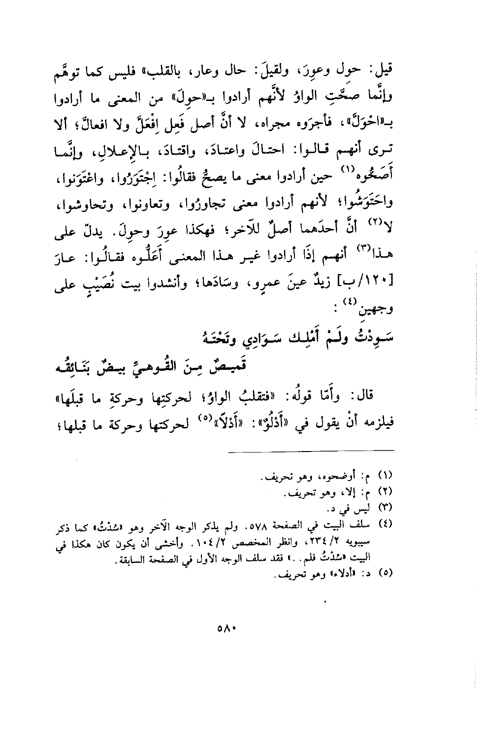 قيل: حول وعور، ولقيل: حال وعار، بالقلب) فليس كما توهم وإنما صحت الواو لأنهم أرادوا بـ (حول) من المعنى ما أرادوا بـ (احول)، فأجروه مجراه، لا أن أصل فعل افعل ولا أفعال؛ ألا ترى أنهم قالوا: احتال واعتاد، واقتاد، بالإعلال، وإنما أصحوه حين أرادوا معنى ما يصح فقالوا: اجتوروا، واعتونوا، واحتوشوا؛ لأنهم أرادوا معنى تجاوروا، وتعاونوا، وتحاوشوا، لا أن أحدهما أصل للآخر؛ فهكذا عور وحول. يدل على هذا أنهم إذا أرادوا غير هذا المعنى أعلوه فقالوا: عار [120/ب] زيد عين عمرو، وسادها؛ وأنشدوا بيت نصيب على وجهين: