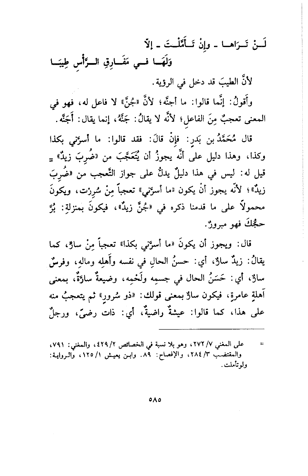 قال محمد بن بدر: فإن قال: فقد قالوا: ما أسرني بكذا وكذا، وهذا دليل على أنه يجوز أن يتعجب من (ضرب زيد) قيل له: ليس في هذا دليل يدل على جواز التعجب من (ضرب زيد)؛ لأنه يجوز أن يكون (ما أسرني) تعجبا من سررت، ويكون محمولا على ما قدمنا ذكره في (جن زيد)، فيكون منزلة: بر حجك فهو مبرور.