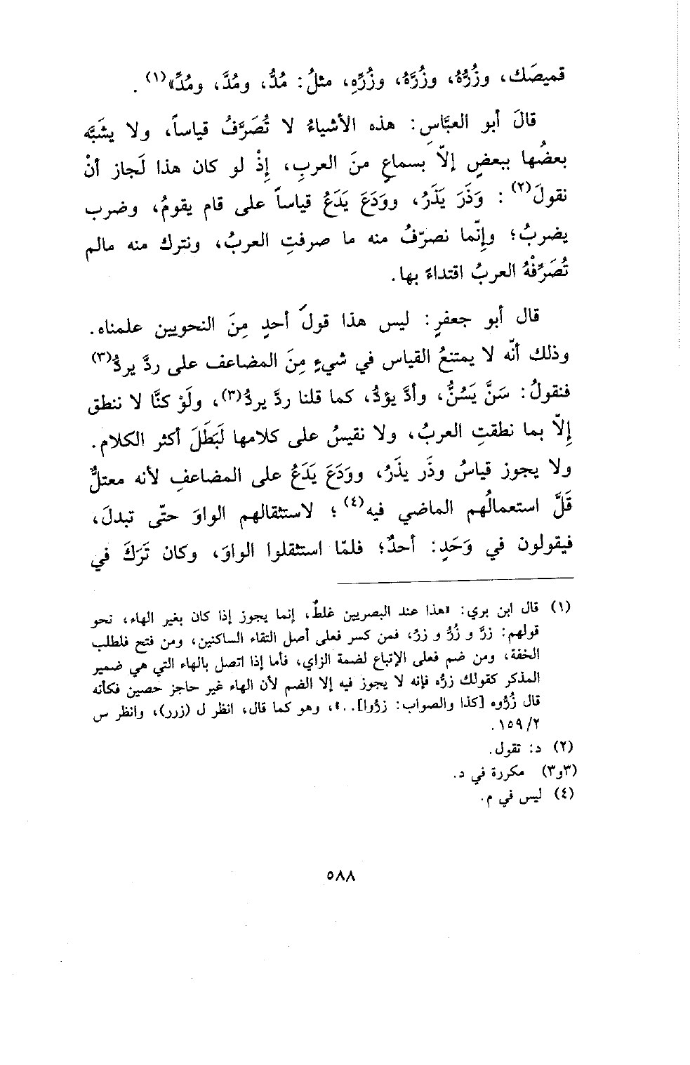 قال أبو جعفر: ليس هذا قول أحد من النحويين علمناه. وذلك أنه لا يمتنع القياس في شيء من المضاعف على رد يرد فنقول: سن يسن، وأد يؤد، كما قلنا رد يرد، ولو كنا لا ننطق إلا بما نطقت العرب، ولا نقيس على كلامها لبطل أكثر الكلام. ولا يجوز قياس وذر يذر، وودع يدع على المضاعف لأنه معتل قل استعمالهم الماضي فيه؛ لاستثقالهم الواو حتى تبدل، فيقولون في وحد: أحد؛ فلما استثقلوا الواو، وكان ترك في