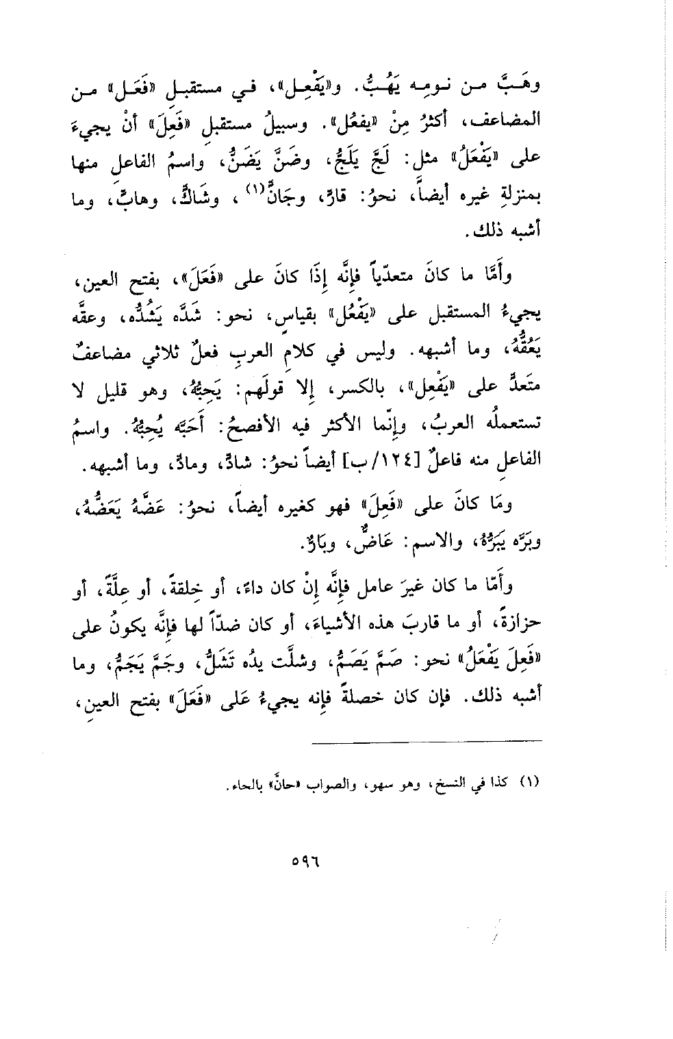 وأما ما كان معتديا فإنه إذا كان على (فعل)، بفتح العين، يجيء المستقبل على (يفعل) بقياس، نحو: شده يشده، وعقه يعقه، وما أشبهه. وليس في كلام العرب فعل ثلاثي مضاعف متعد على (يفعل)، بالكسر، إلا قولهم: يحبه، وهو قليل لا تستعمله العرب، وإنما الأكثر فيه الأفصح: أحبه يحبه. واسم الفاعل منه فاعل [124/ب] أيضا نحو: شاد، وماد، وما أشبهه.