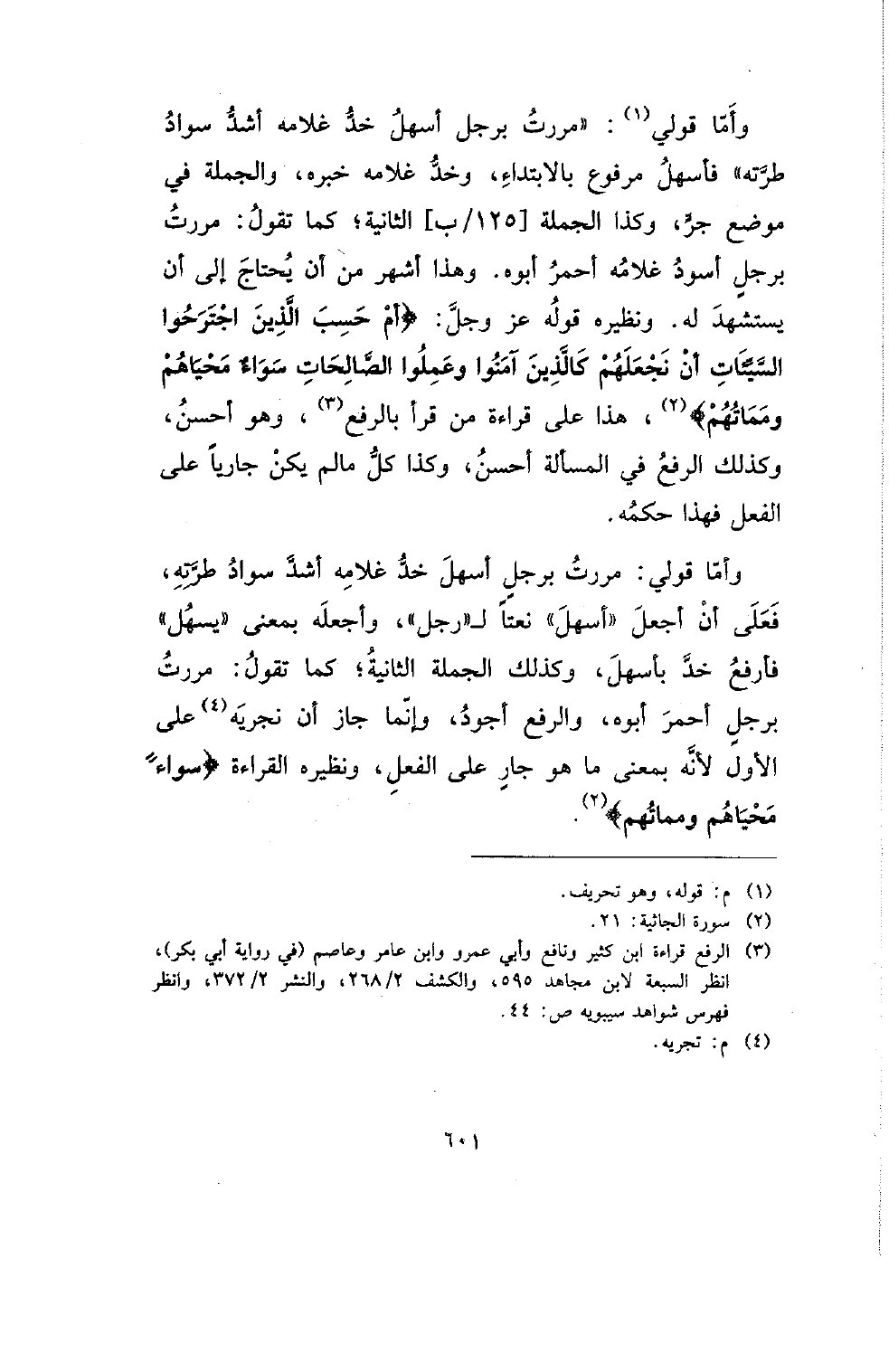 وأما قولي: مررت برجل أسهل خذ غلامه أشد سواد طرته، فعلى أن أجعل (أسهل) نعتا لـ (رجل)، وأجعله بمعنى (يسهل) فأرفع خد بأسهل، وكذلك الجملة الثانية؛ كما تقول: مررت برجل أحمر أبوه، والرفع أجود، وإنما جاز أن نجريه على الأول لأنه بمعنى ما هو جار على الفعل، ونظيره القراءة {سواء محياهم ومماتهم}.