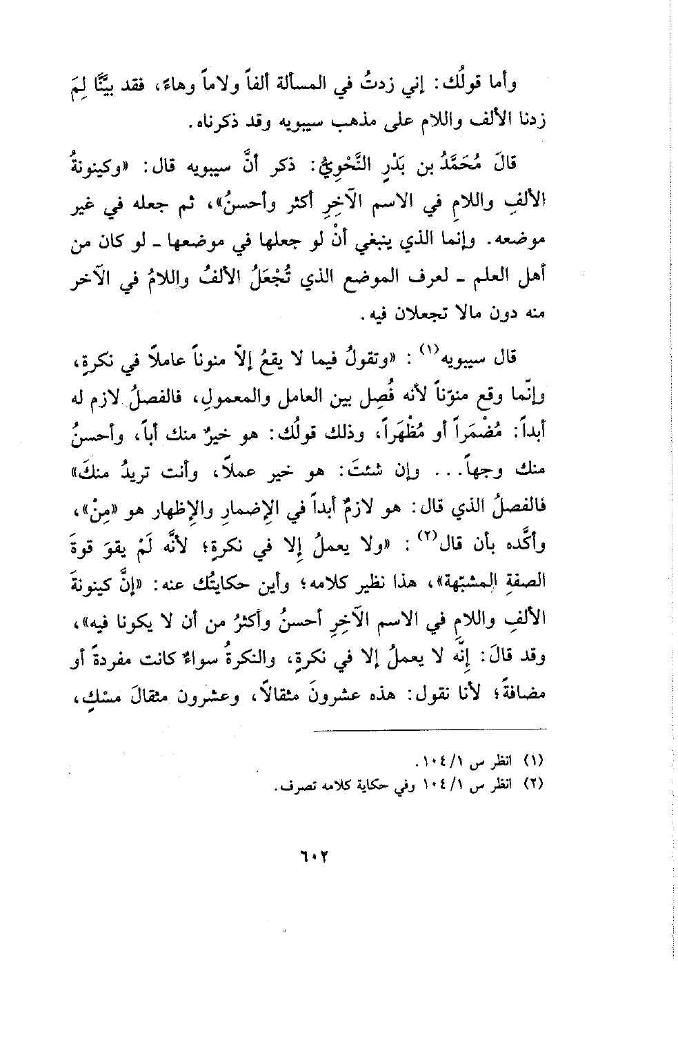 قال سيبويه: (وتقول فيما لا يقع إلا منونا عاملا في نكرة، وإما وقع منونا لأنه فصل بين العامل والمعمول، فالفصل لازم له أبدا: مضمرا أو مظهرا، وذلك قولك: هو خير منك أبا، وأحسن منك وجها ... وإن شئت: هو خير عملا، وأنت تريد منك) فالفصل الذي قال: هو لازم أبدا في الإضمار والإظهار هو (من)، وأكده بأن قال: (ولا يعمل إلا في نكرة؛ لأنه لم يقو قوة الصفة المشبهة)، هذا نظير كلامه؛ وأين حكايتك عنه: (إن كينونة الألف واللام في الاسم الآخر أحسن وأكثر من أن لا يكونا فيه)، وقد قال: إنه لا يعمل إلا في نكرة، والنكرة سواء كانت مفردة أو مضافة؛ لأنا نقول: هذه عشرون مثقالا، وعشرون مثقال مسك،