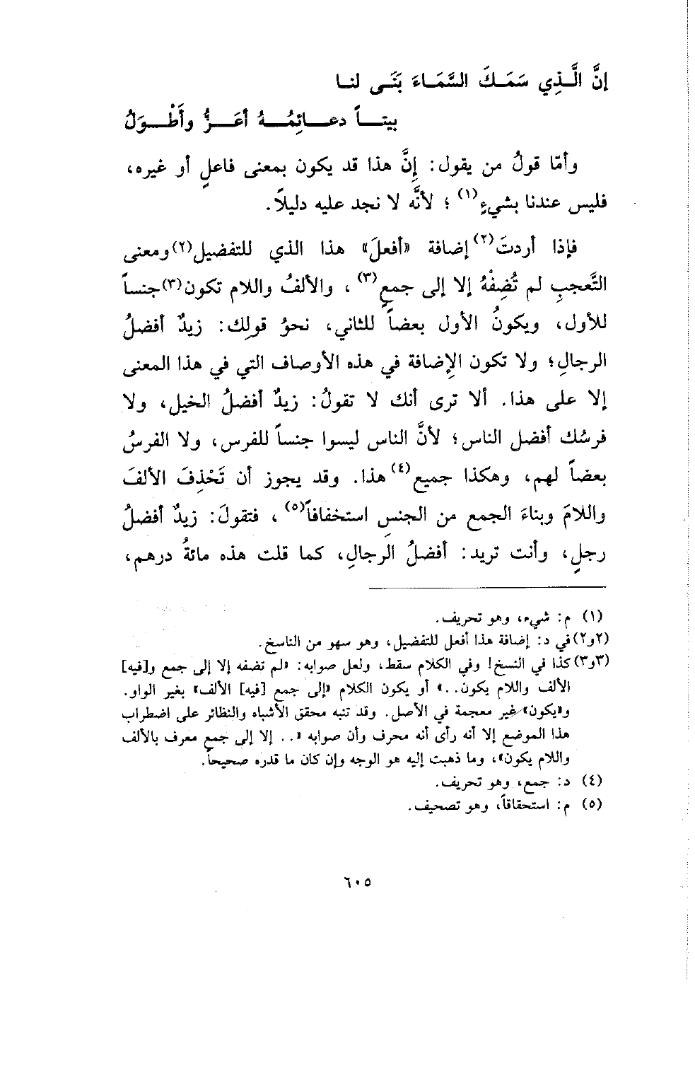 فإذا أردت إضافة (أفعل) هذا الذي لتفضيل ومعنى التعجب لم تضفه إلا إلى جمع، والألف واللام تكون جنسا للأول، ويكون الأول بعضا للثاني، نحو قولك: زيد أفضل الرجال؛ ولا تكون الإضافة في هذه الأوصاف التي في هذا المعنى إلا على هذا. ألا ترى أنك لا تقول: زيد أفصل الخيل، ولا فرسك أفضل الناس؛ لأن الناس ليسوا جنسا للفرس، ولا الفرس بعضا لهم، وهكذا جميع هذا. وقد يجوز أن تحذف الألف واللام وبناء الجمع من الجنس استخفافا، فتقول: زيد أفضل رجل، وأنت تريد: أفضل الرجال، كما قلت هذه مائة درهم،