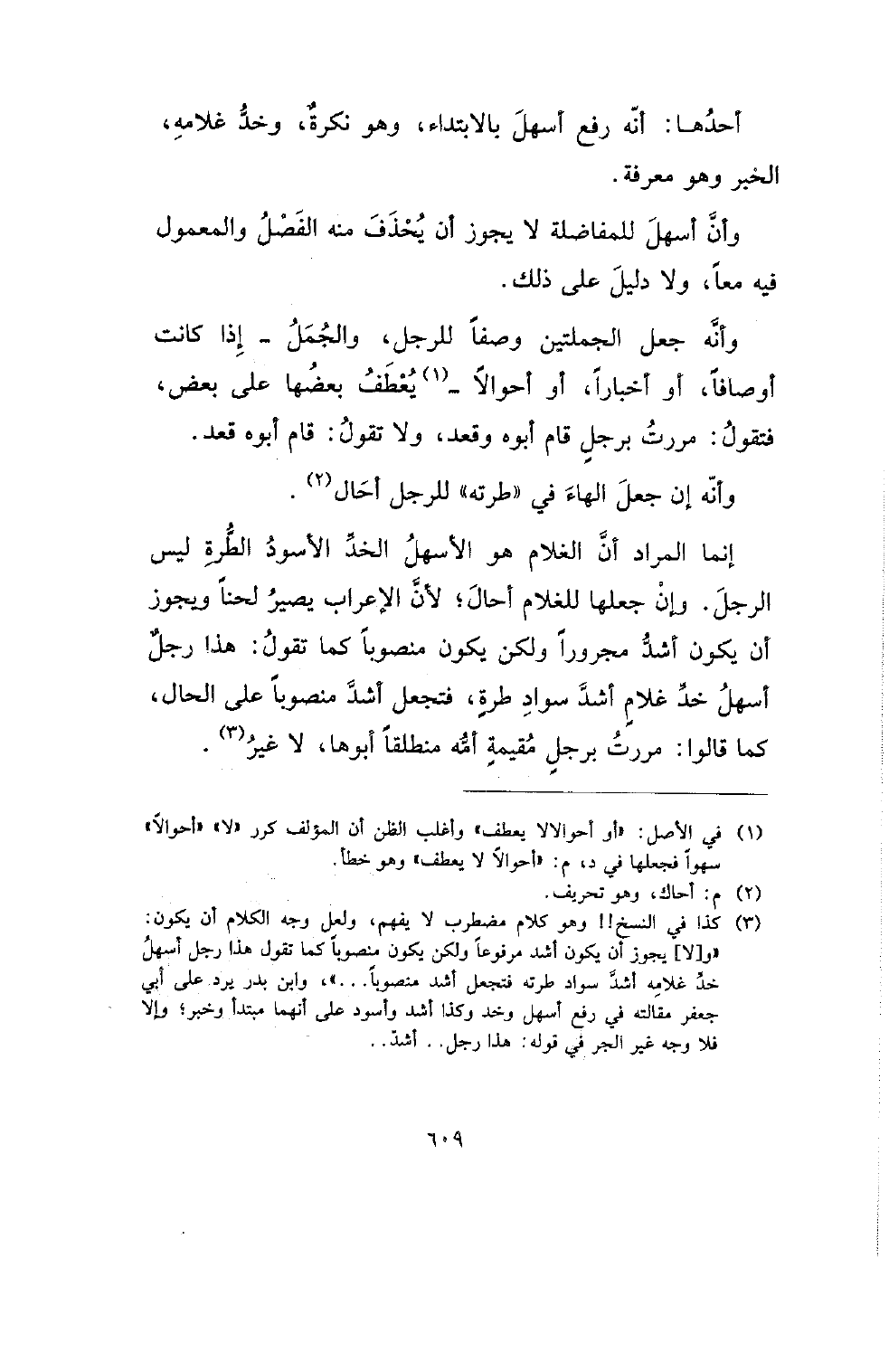 إنما المراد أن الغلام هو الأسهل الخد الأسود الطرة ليس الرجل. وإن جعلها للغلام أحال؛ لأن الإعراب يصير لحنا ويجوز أن يكون أشد مجرورا ولكن يكون منصوبا كما تقول: هذا رجل أسهد خد غلام أشد سواد طرة، فتجعل أشد منصوبا على الحال، كما قالوا: مررت برجل مقيمة أمه منطلقا أبوها، لا غير.
