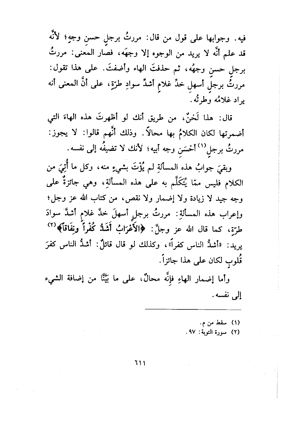 وبقي جواب هذه المسألة لا يؤت بشيء منه، وكل ما أتي من الكلام فليس مما يتكلم به على هذه المسألة، وهي جائزة على وجه جيد لا زيادة ولا إضمار ولا نقص، من كتاب الله عز وجل؛ وإعراب هذه المسألة: مررت برجل أسهل خد غلام أشد سواد طرة، كما قال الله عز وجل: {الأعراب أشد كفرا ونفاقا} يريد: (أشد الناس كفرا)، وكذلك لو قال قائل: أشد الناس كفر قلوب لكان على هذا جائزا.