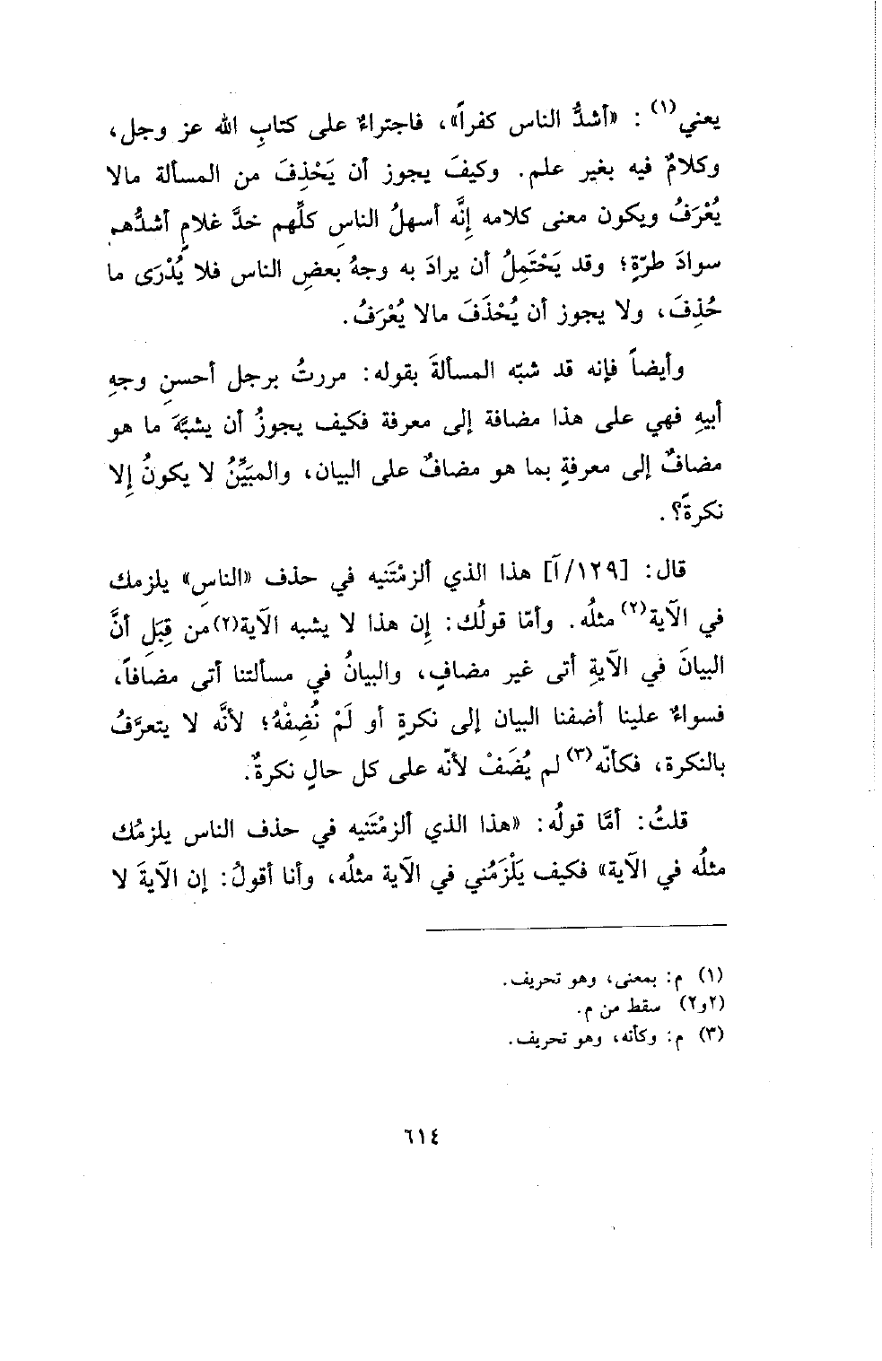 يعني: (أشدُّ الناس كفرا)، فاجتراء على كتاب الله عز وجل، وكلام فيه بغير علم. وكيف يجوز أن يحذف من المسألة مالا يعرف ويكون معنى كلامه إنه أسهل الناس كلهم خد غلام أشدهم سواد طرة؛ وقد يحتمل أن يراد به وجه بعض الناس فلا يدرى ما حذف، ولا يجوز أن يحذف مالا يعرف.