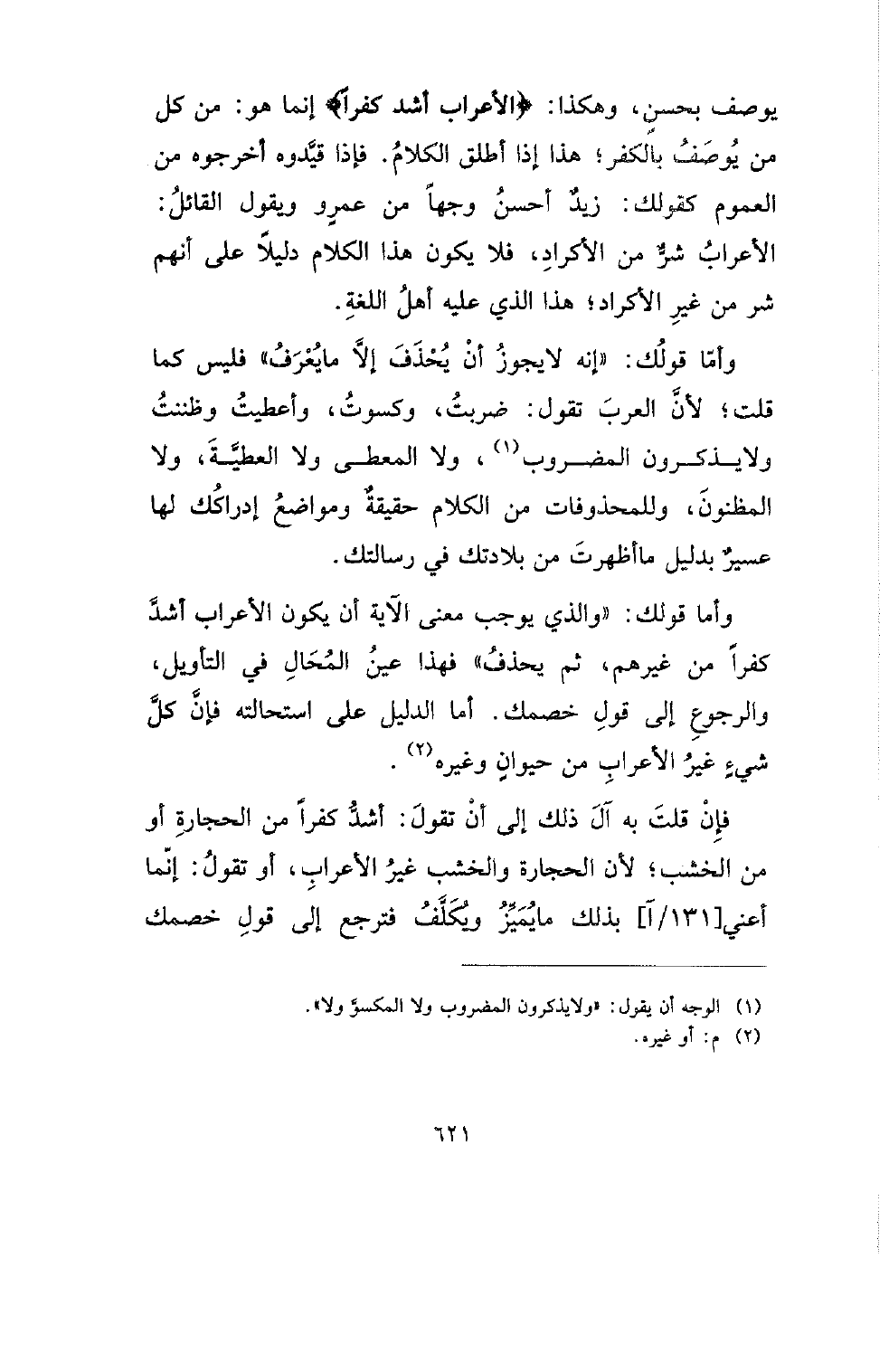 وأما قولك: (والذي يوجب معنى الآية أن يكون الأعراب أشد كفرا من غيرهم، ثم يحذف) فهذا غير المحال في التأويل، والرجوع إلى قول خصمك. أما الدليل على استحالته فإن كل شيء غير الأعراب من حيوان وغيره.