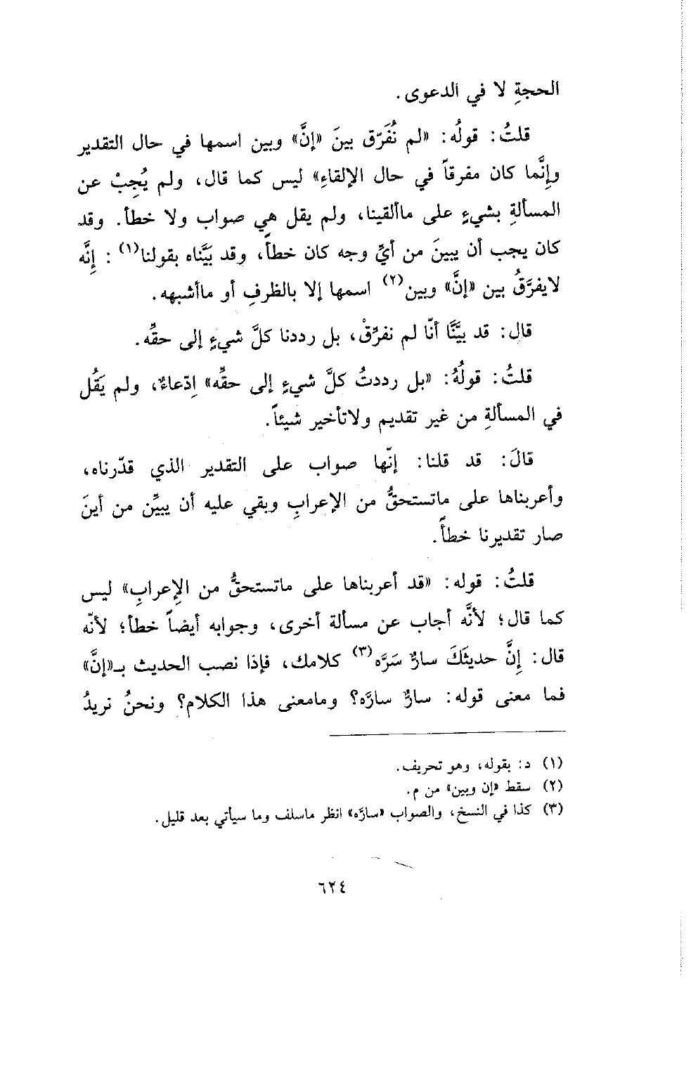 قلت: قوله: (قد أعربناها على ما تستحق من الإعراب) ليس كما قال؛ لأنه أجاب عن مسألة أخرى، وجوابه أيضا خطأ؛ لأنه قال: إن حديثك سار سره كلامك، فإذا نصب الحديث بـ (إن) فما معنى قله: سار ساره؟ وما معنى هذا الكلام؟ ونحن نريد