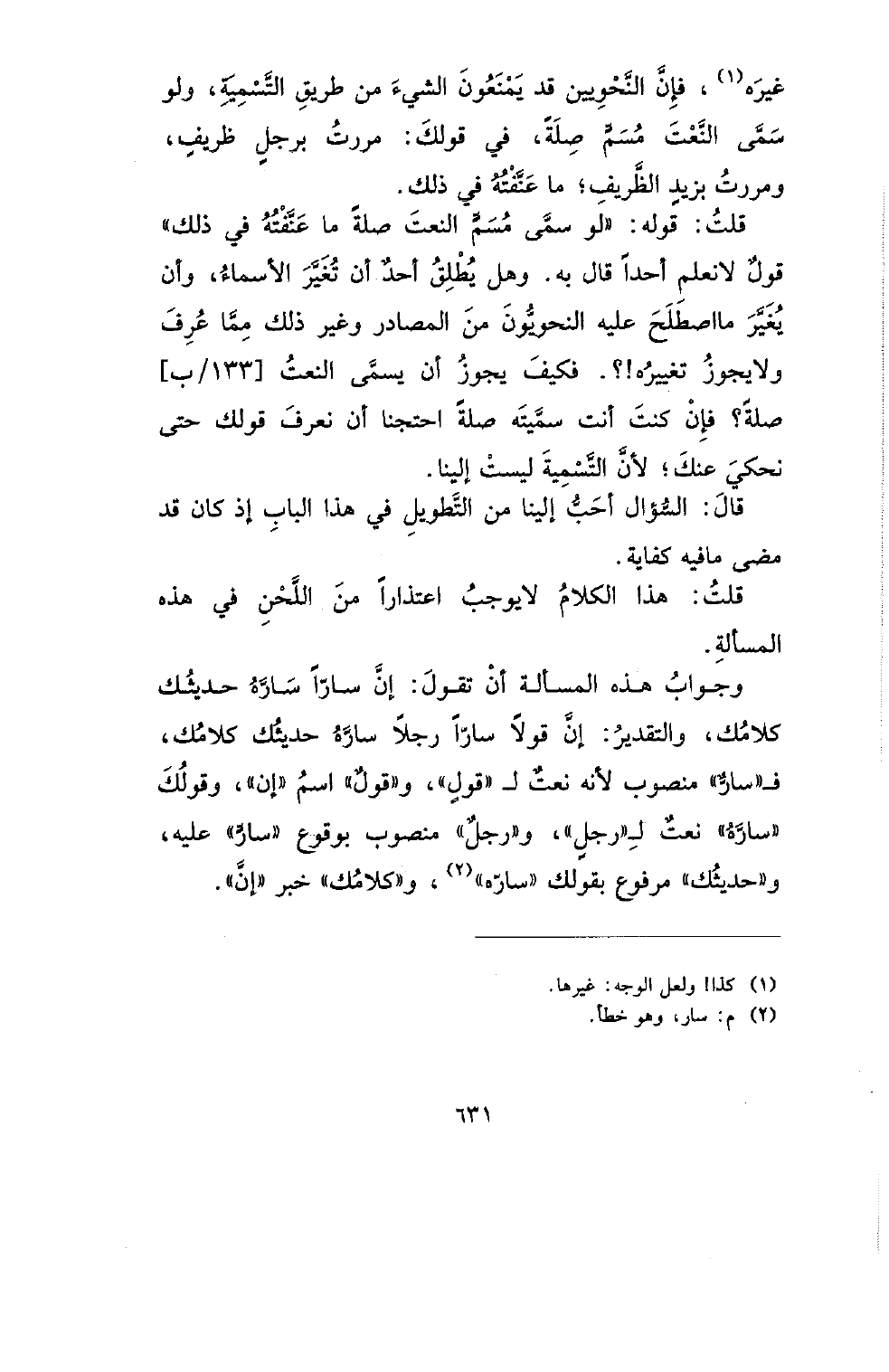 قلت: قوله: (لو سمى مسم النعت ما عنفته في ذلك) قول لا نعلم أحدا قال به. وهل يطلق أحد أن تغير الأسماء، وأن يغير ما اصطلح عليه النحويون من المصادر وغير ذلك مما عرف ولا يجوز تغييره!؟. فكيف يجوز أن يسمى النعت [133/ب] صلة؟ فإن كنت أنت سميته صل احتجنا أن نعرف قولك حتى نحكي عنك؛ لأن التسمية ليست إلينا.