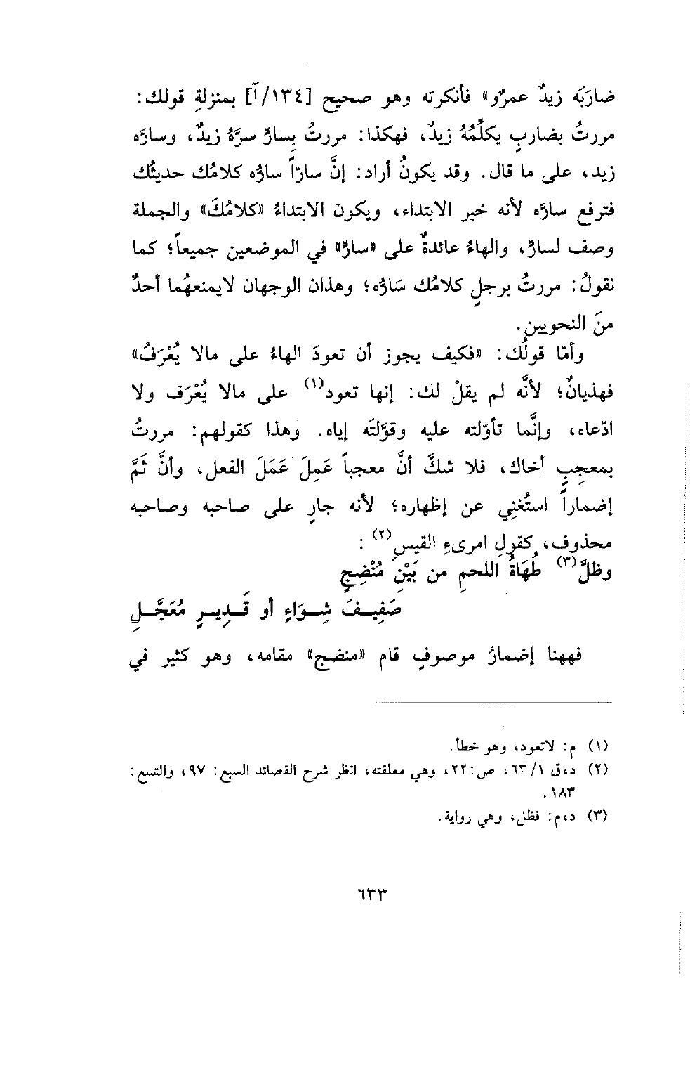 وأما قولك: (فكيف يجوز أن تعود الهاء على مالا يعرف) فهذيان؛ لأنه لم يقل لك: إنها تعود على ما لا يعرف ولا ادعاه، وإنما تأولته عليه قولته إياه. وهذا كقولهم: مررت بمعجب أخاك، فلا شك أن معجبا عمل عمل الفعل، وأن ثم إضمارا استغني عن إظهاره؛ لأنه جار على صاحبه وصاحبه محذوف، كقول امرئ القيس: