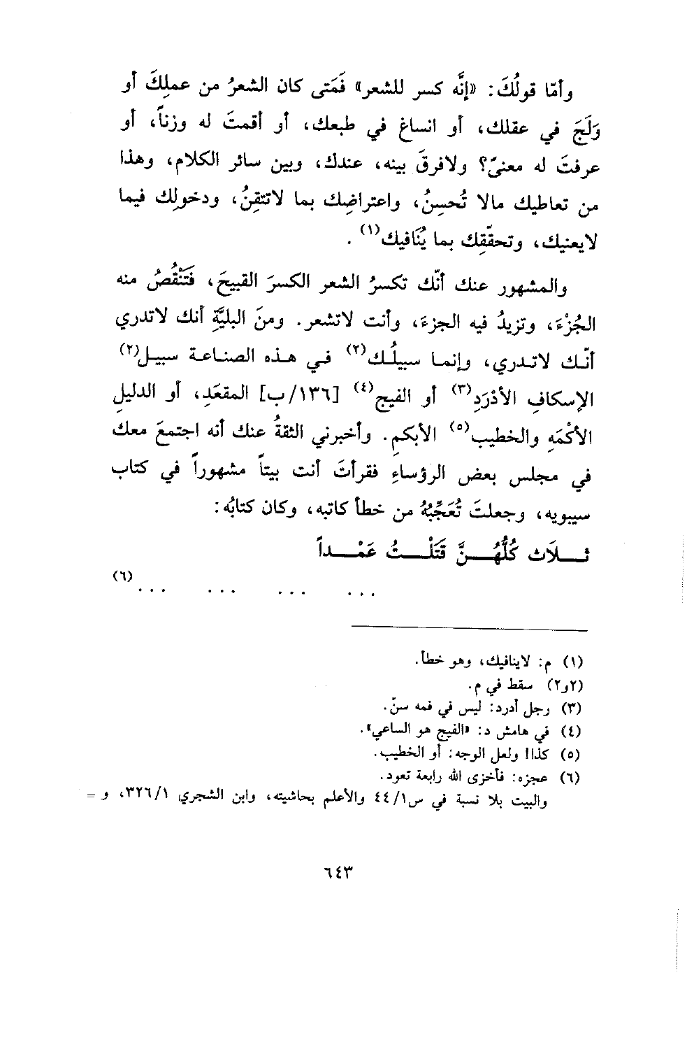 والمشهور عنك أنك تكسر الشعر الكسر القبيح، فتنقص منه الجزء، تزيد فيه الجزء، وأنت لا تشعر. ومن البلية أنك لا تدري أنك لا تدري، وإنما سبيلك في هذه الصناعة سبيل الإسكاف الأدرد أو الفيج [136/ب] المقعد، أو الدليل الأكمه والخطيب الأبكم. وأخبرني الثقة عنك أنه اجتمع معك في مجلس بعض الرؤساء فقرأت أنت بيتا مشهورا في كتاب سيبويه، وجعلت تعجبه من خطأ كاتبه، وكان كتابه: