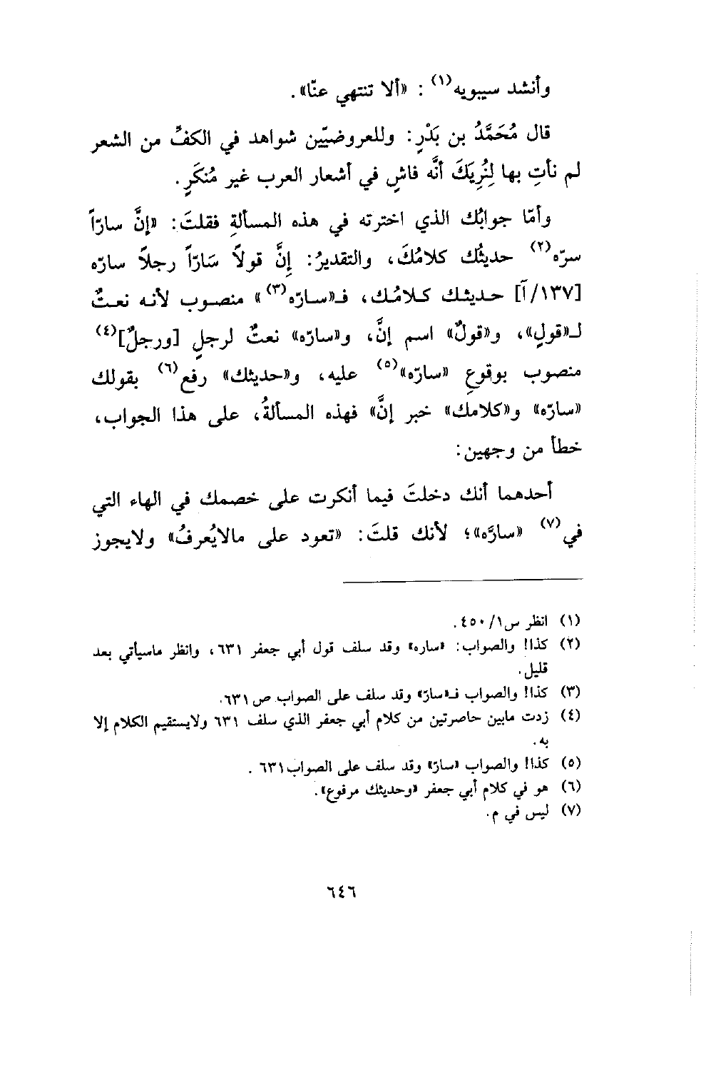 وأما جوابك الذي أختره في هذه المسألة فقلت: (إن سارا سره حديثك كلامك، والتقدير: إن قولا سارا رجلا ساره [137/آ] حديثك كلامك، فـ (ساره) منصوب لأنه نعت لـ (قول)، و (قول) اسم إن، و (ساره) نعت لرجل [ورجل] منصوب بوقوع (ساره) عليه، و (حديثك) رفع بقولك (ساره) و (كلامك) خبر إن) فهذه المسألة، على هذا الجواب، خطا من وجهين: