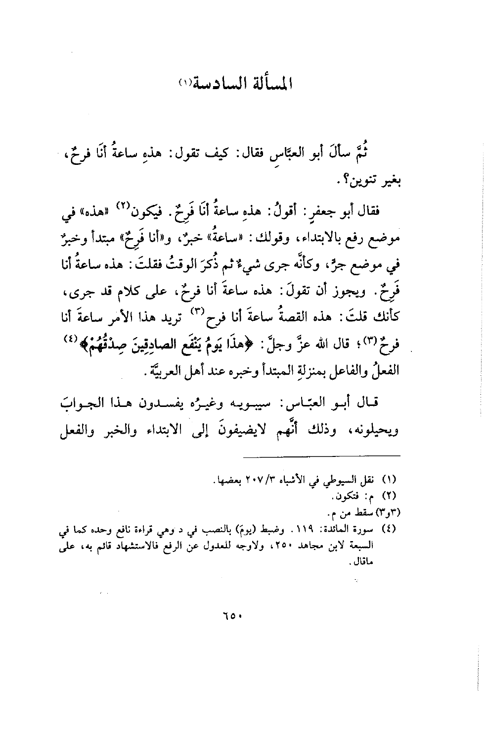 ثم سأل أبو العباس فقال: كيف تقول: هذه ساعة أنا فرح، بغير تنوين؟