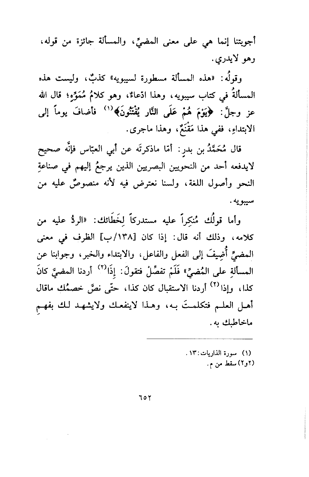 قال محمد بن بدر: أما ما ذكرته عن أبي العباس فإنه صحيح لا يدفعه أحد من النحويين البصريين الذي يرجع إليهم في صناعة النحو وأصول اللغة، ولسنا نعترض فيه لأنه منصوص عليه من سيبويه.
