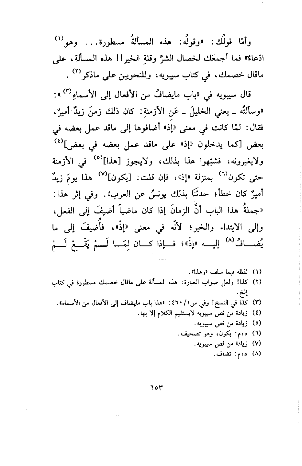 قال سيبويه في (باب ما يضاف من الأفعال إلى الأسماء): (وسألته- يعني الخليل- عن الأزمنة: كان ذلك زمن زيد أمير، فقال: لما كانت في معنى (إذا) أضافوها إلى ما قد عمل بعضه في بعض [كما يدخلون (إذا) على ما قد عمل بعضه في بعض] ولا يغيرونه، فشبهوا هذا بذلك، ولا يجوز [هذا] في الأزمنة حتى تكون بمنزلة (إذا)، فإن قلت: [يكون] هذا يوم زيد امير كان خطأ؛ حدثنا بذلك يونس عن العرب). وفي إثر هذا: (جملة هذا الباب أن الزمان إذا كان ماضيا أضيف إلى الفعل، وإلى الابتداء والخبر؛ لأنه في معنى (إذ)، فأضيف إلى ما يضاف إليه (إذ)؛ فإذا كان لما لم يقع لم