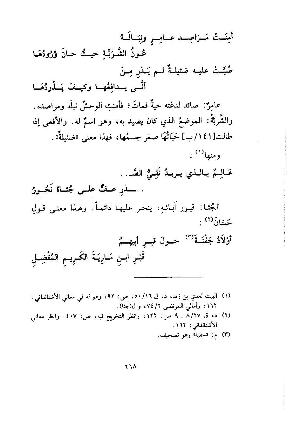 عامر: صائد لدغته حية فمات؛ فأمنت الوحش نبله ومراصده. والشربة: الموضع الذي كان يصيد به، وهو اسم له. والأفعى إذا طالت [141/ب] حياتها صغر جسمها، فهذا معنى (ضئيلة).