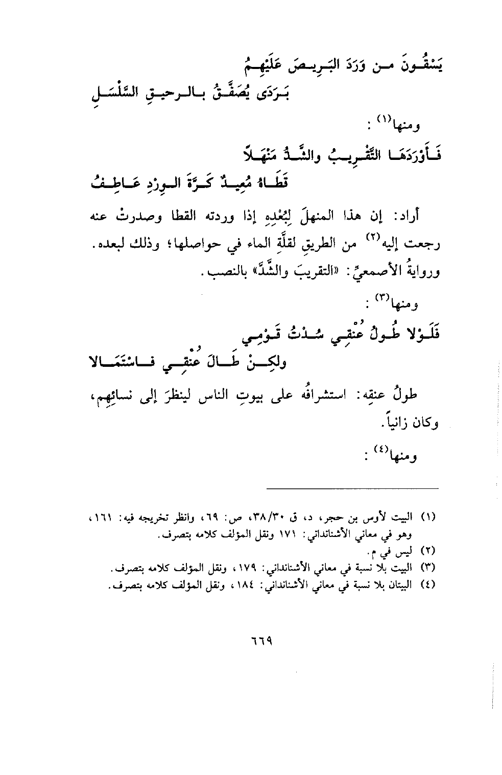 أراد: إن هذا المنهل لعبده إذا وردته القطا وصدرت عنه رجعت إليه من الطريق لقلة الماء في حواصلها؛ وذلك لبعده. ورواية الأصمعي: (التقريب والشد) بالنصب.