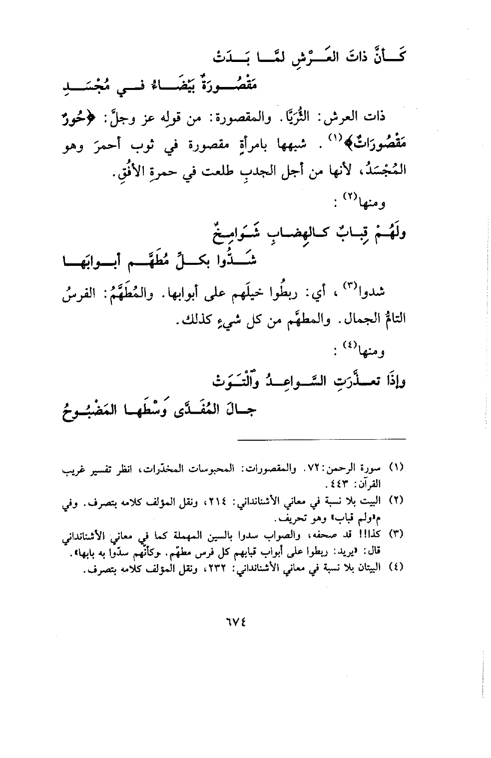 ذات العرش: الثريا. والمقصور: من قوله عز وجل: {حور مقصورات}. شبهها بامرأة مقصورة في ثوب أحمر وهو المجسد، لأنها من أجل الجدب طلعت في حمرة الأفق.