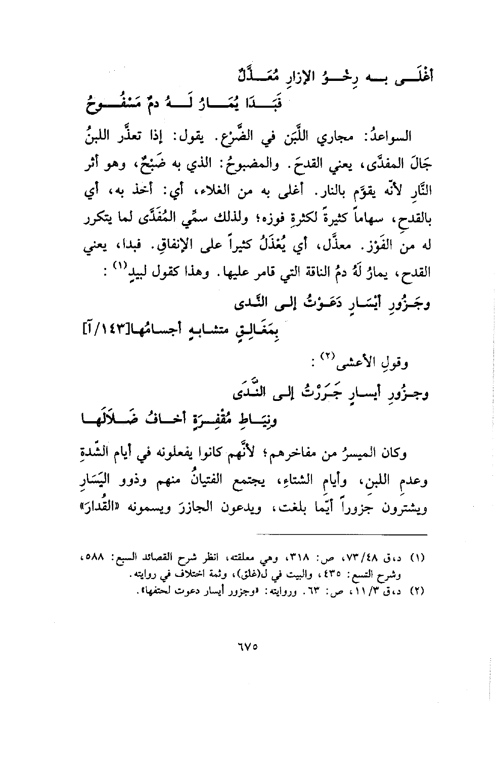 وكان الميسر من مفاخرهم؛ لأنهم كانوا يفعلونه في أيام الشدة وعدم اللبن، وأيام الشتاء، يجتمع الفتيان منهم وذوو اليسار ويشترون جزورا أيما بلغت، ويدعون الجازر ويسمونه (القدار)