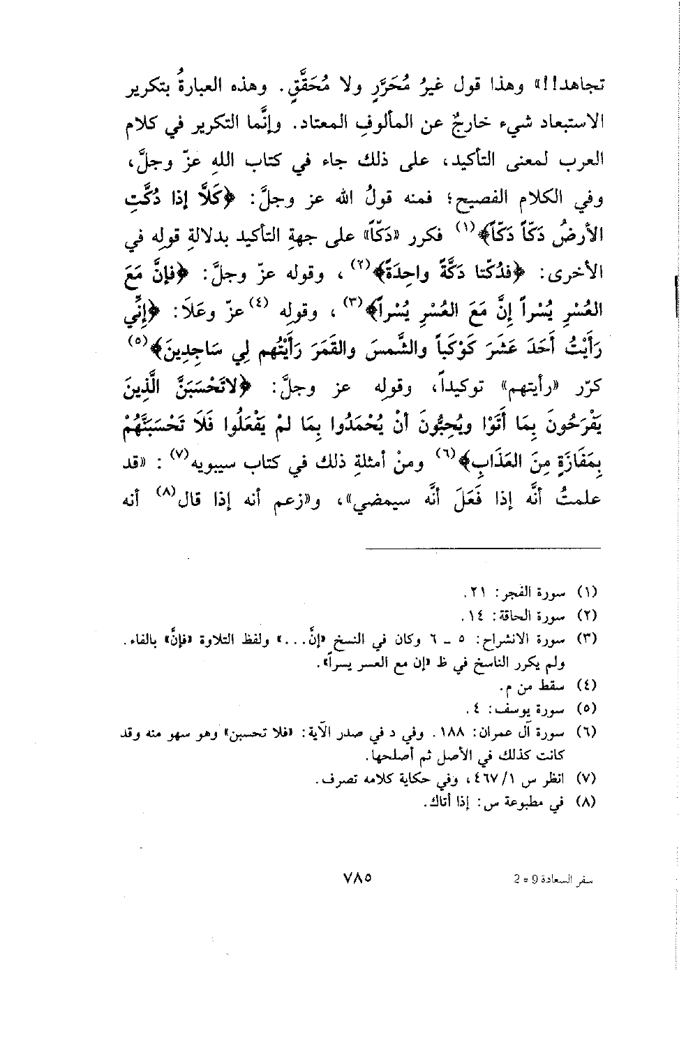 تجاهد!!) وهذا قول غير محرر ولا محقق. وهذه العبارة بتكرير الاستبعاد شيء خارج عن المألوف المعتاد. وإنما التكرير في كلام العرب لمعنى التأكيد، على ذلك جاء في كتاب الله عز وجل: {كلا إذا دكت الأرض دكا دكا} فكرر (دكا) على جهة التأكيد بدلالة قوله في الأخرى: {فدكتا دكة واحدة}، وقوله عز وجل: {فإن مع العسر يسرا إن مع العسر يسرا}، وقوله عز وعلا: {إني رأيت أحد عشر كوكبا والشمس والقمر رأيتهم لي ساجدين} كرر (رأيتهم) توكيدا، وقوله عز وجل: {لا تحسبن الذين يفرحون بما أتوا ويحبون أن يحمدوا بما لم يفعلوا فلا تحسبنهم بمفازة من العذاب} ومن أمثلة ذلك في كتاب سيبويه: (قد علمت أنه إذا فعل أنه سيمضي)، و (زعم أنه إذا قال أنه