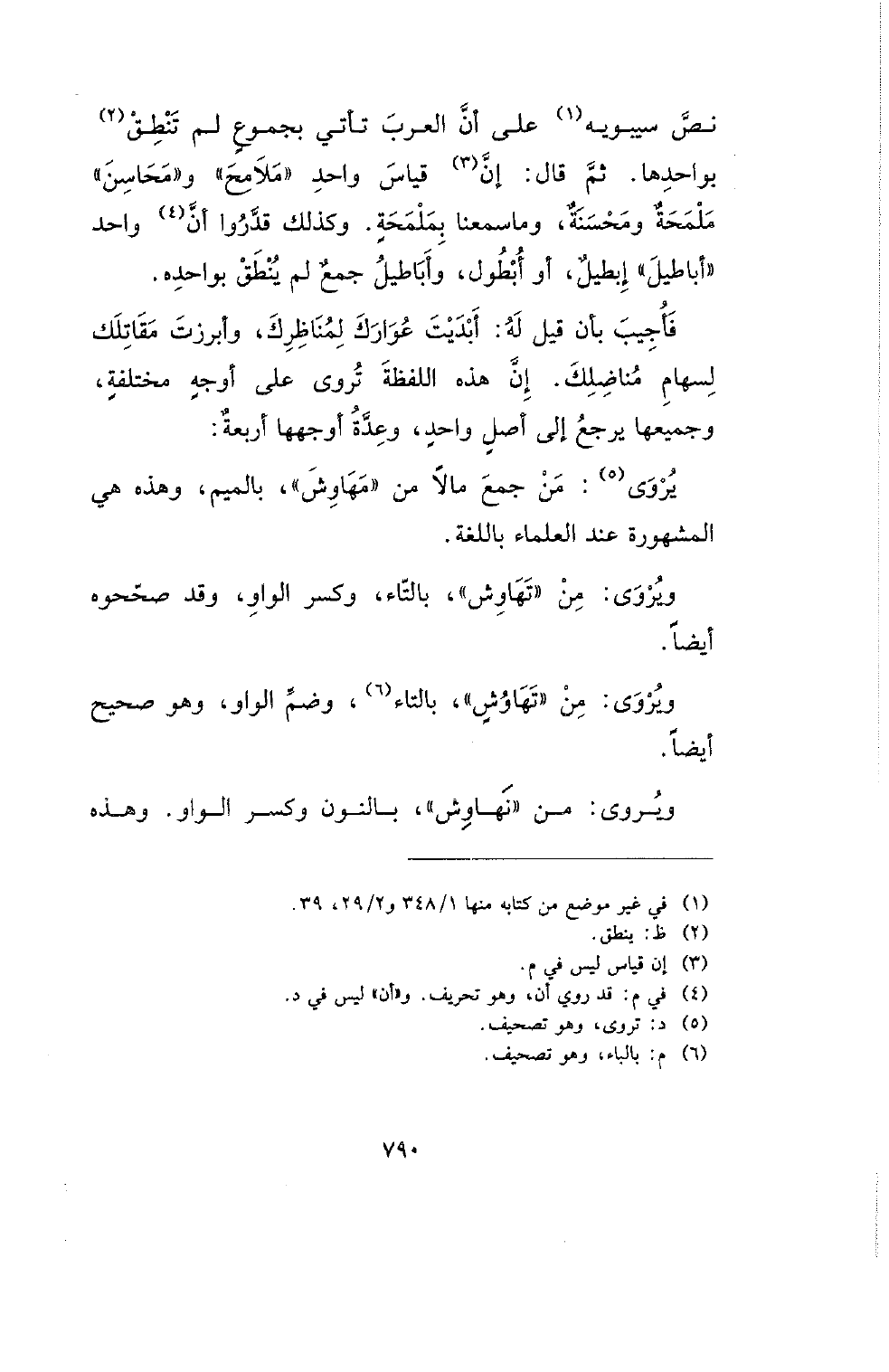 نص سيبويه على أن العرب تأتي بجموع لم تنطق بواحدها. ثم قال: إن قياسواحد (ملامح) و (محاسن) ملمحة ومحسنة، وما سمعنا بملمحة. وكذلك قدروا أن واحد (أباطيل) إبطيل، أو أبطول، وأباطيل جمع لم ينطق بواحده.