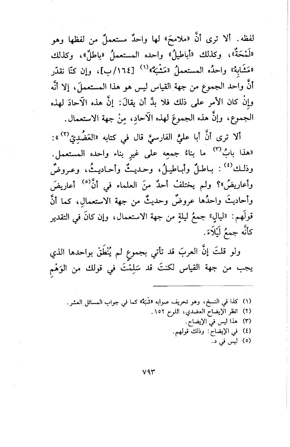 ألا ترى أن أبا علي الفارسي قال في كتابه (العضدي): (هذا باب ما بناء جمعه على غير بناء واحده المستعمل. وذلك: باطل وأباطيل، وحديث وأحاديث، وعروض وأعاريض)؟ ولم يختلف أحد من العلماء في أن أعاريض وأحاديث واحدها عروض وحديث من جهة الاستعمال، كما أن قولهم: (ليال) جمع ليلة من جهة الاستعمال، وإن كان في التقدير كأنه جمع ليلاء.