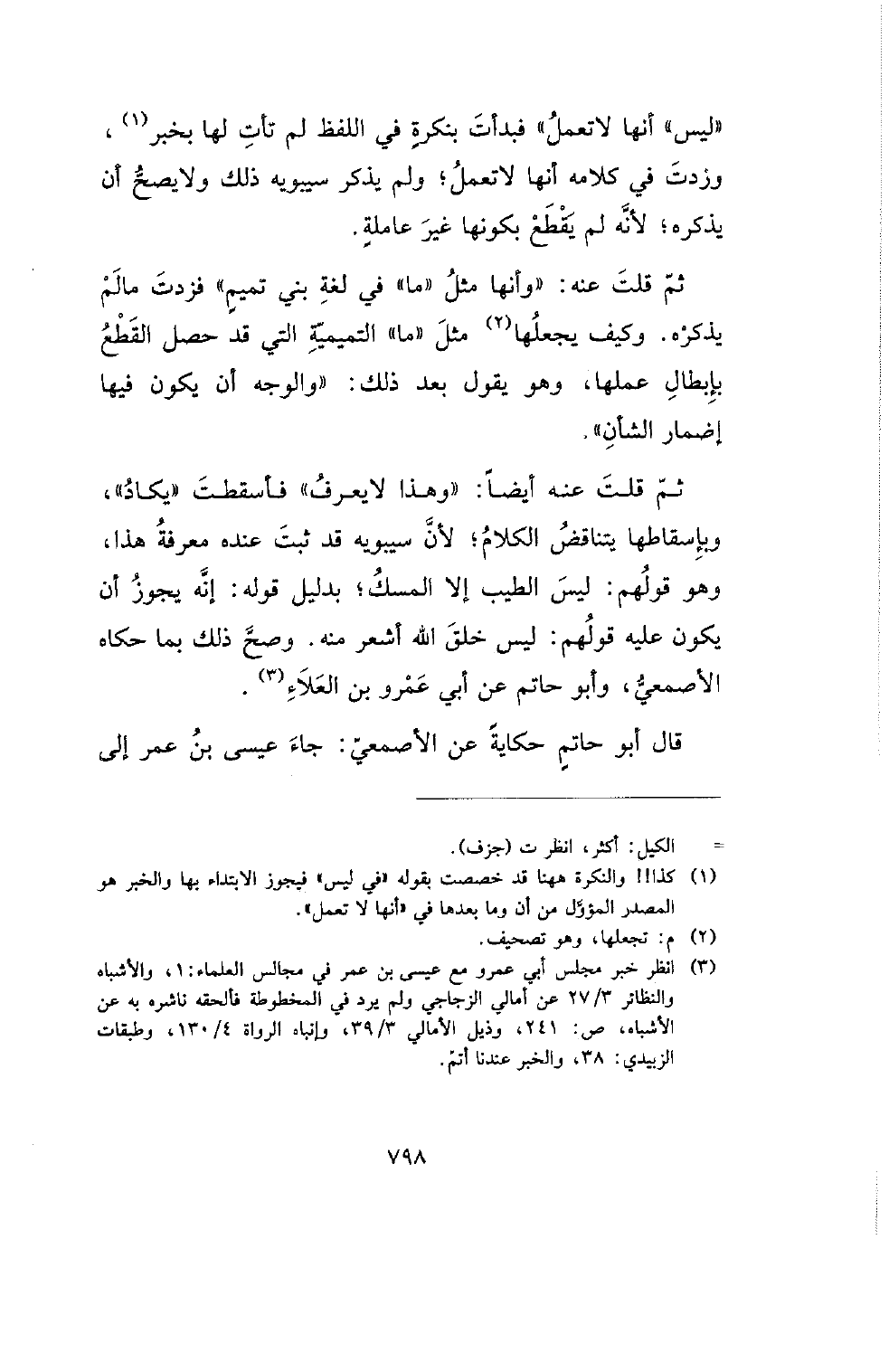 (ليس) أنها لا تعمل) فبدأت بنكرة في اللفظ لم تأت لها بخبر، وزدت في كلامه أنها لا تعمل؛ ولم يذكر سيبويه ذلك ولا يصح أن يذكره؛ لأنه لم يقطع بكونها غير عاملة.