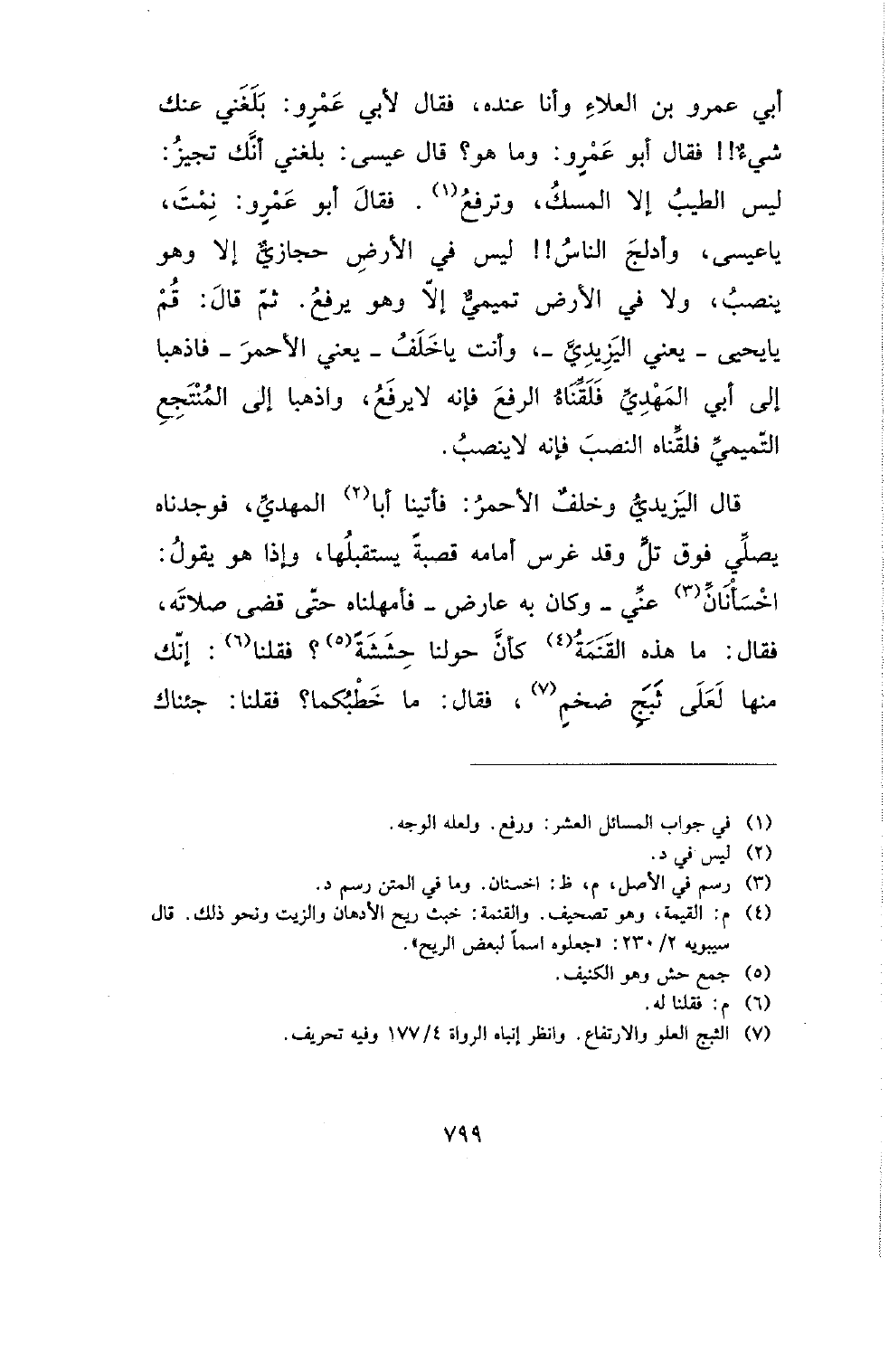 أبي عمرو بن العلاء وأنا عنده، فقال لأبي عمرو: بلغني عنك شيء!! فقال أبو عمرو: وما هو؟ قال عيسى: بلغني أنك تجيز: ليس الطيب إلا المسك، وترفع. فقال أبو عمرو: نمت، يا عيسى، وأدلج الناس!! ليس في الأرض حجازي إلا وهو ينصب، ولا في الأرض تميمي إلا وهو يرفع. ثم قال: قم يا يحيى- يعني اليزيدي-، وأنت يا خلف- يعني الأحمر- فاذهبا إلى أبي المهدي فلقناه الرفع فإنه لا يرفع، واذهبا إلى المنتجع التميمي فلقناه النصب فإنه لا ينصب.