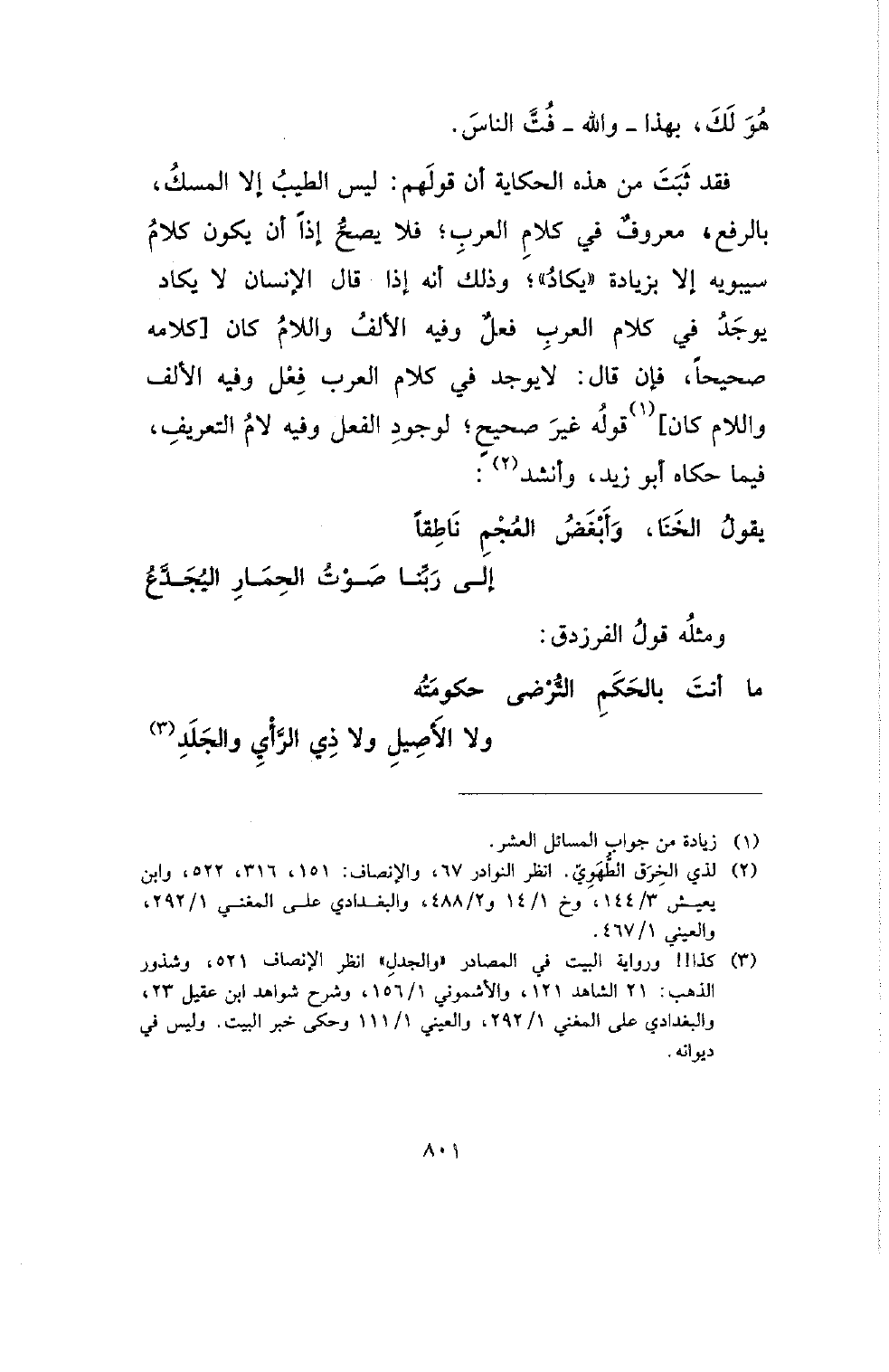 فقد ثبت من هذه الحكاية أن قولهم: ليس الطيب إلا المسك، بالرفع، معروف في كلام العرب؛ فلا يصح إذًا أن يكون كلام سيبويه إلا بزيادة (يكاد)، وذلك أنه إذا قال الإنسان لا يكاد يوجد في كلام العرب فعل وفيه الألف واللام كان [كلامه صحيحًا، فإن قال: لا يوجد في كلام العرب فعل وفيه الألف واللام كان] قوله غير صحيح؛ لوجود الفعل وفيه لام التعريف، فيما حكاه أبو زيد، وأنشد: