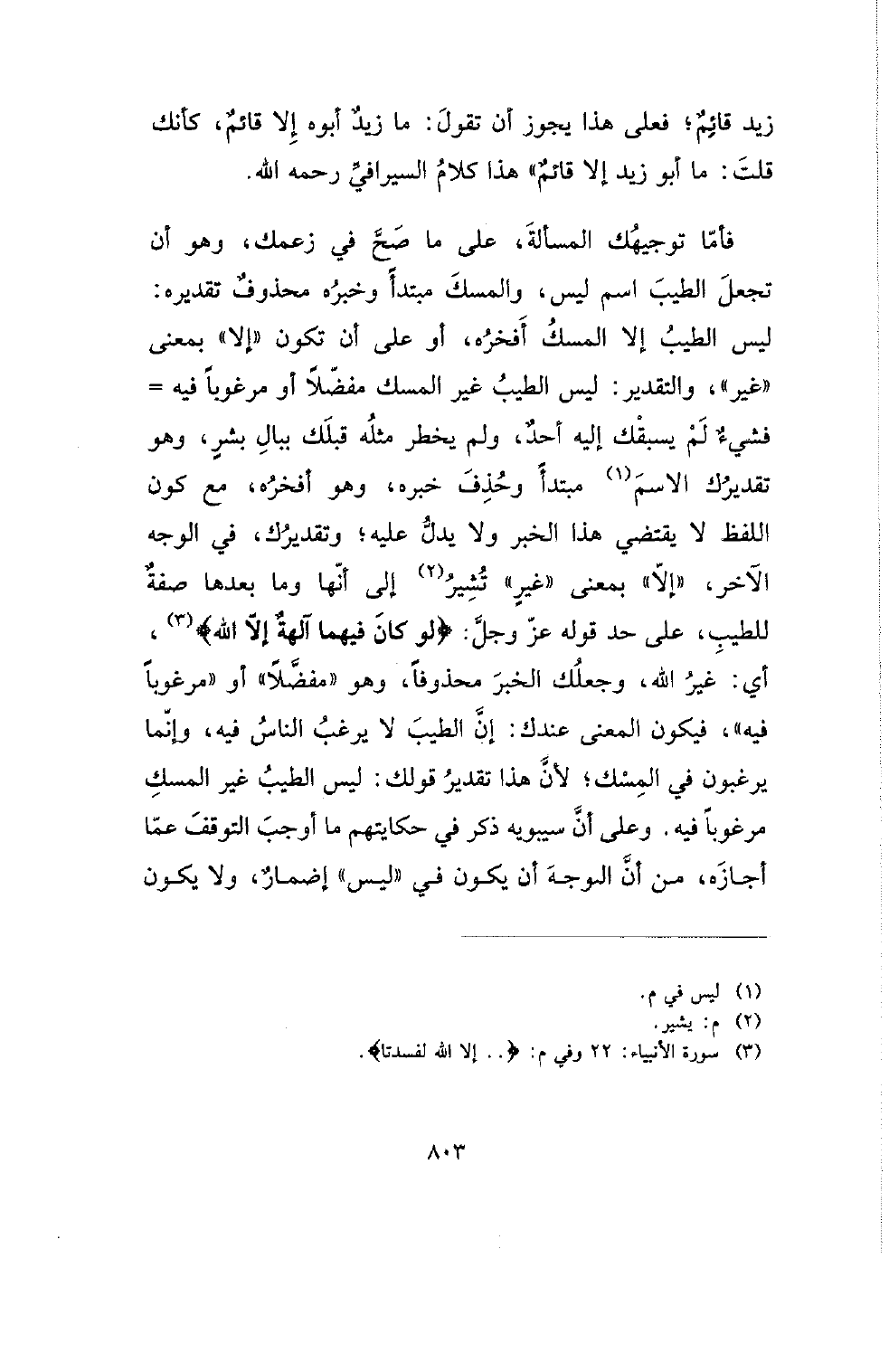 فأما توجيهك المسألة، على ما صح في زعمك، وهو أن تجعل الطيب اسم ليس، والمسك مبتدأ وخبره محذوٌف تقديره: ليس الطيب إلا المسك أفخره، أو على أن تكون (إلا) بمعنى (غير)، والتقدير: ليس الطيب غير المسك مفضلًا أو مرغوبًا فيه= فشيٌء لم يسبقك إليه أحد، ولم يخطر مثله قبلك ببال بشر، وهو تقديرك الاسم مبتدأ وحذف خبره، وهو أفخره، مع كون اللفظ لا يقتضي هذا الخبر ولا يدل عليه؛ وتقديرك، في الوجه الآخر، (إلا) بمعنى (غير) تشير إلى أنها وما بعدها صفة للطيب، على حد قوله عز وجل:} لو كان فيهما آلهة إلا الله {، أي: غير الله، وجعلك الخبر محذوفًا، وهو (مفضلًا) أو (مرغوبًا فيه)، فيكون المعنى عندك: إن الطيب لا يرغب الناس فيه، وإنما يرغبون في المسك؛ لأن هذا تقدير قولك: ليس الطيب غير المسك مرغوبًا فيه. وعلى أن سيبويه ذكر في حكايتهم ما أوجب التوقف عما أجازه، من أن الوجه أن يكون في (ليس) إضمار، ولا يكون