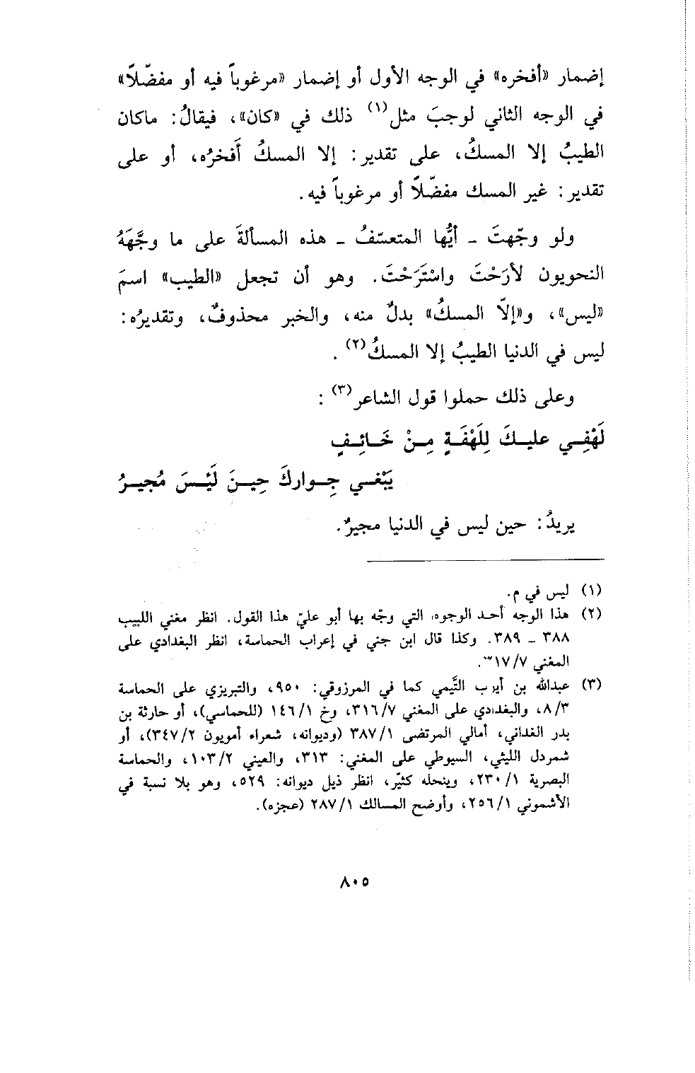 ولو وجهت -أيها المتعسف- هذه المسألة على ما وجهه النحويون لأرحت واسترحت. وهو أن تجعل (الطيب) اسم (ليس)، و (إلا المسك) بدل منه، والخبر محذوف، وتقديره: ليس في الدنيا الطيب إلا المسك.