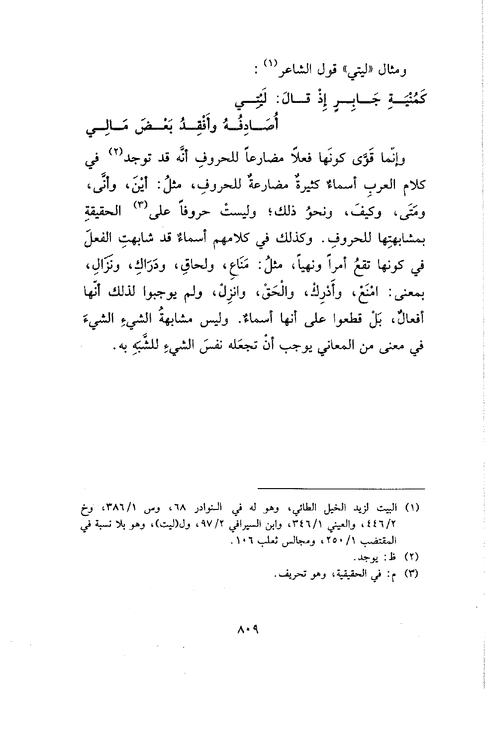 وإنما قوى كونها فعلًا مضارعًا للحروف أنه قد توجد في كلام العرب أسماء كثيرة مضارعة للحروف، مثل: أين، وأنى، ومتى، وكيف، ونحو ذلك؛ وليست حروفًا على الحقيقة بمشابهتها للحروف. وكذلك في كلامهم أسماء قد شابهت الفعل في كونها تقع أمرًا ونهيًا، مثل: مناع، ولحاق، ودراك، ونزال، بمعنى: امنع، وأدرك، والحق، وانزل، ولم يوجبوا لذلك أنها أفعال، بل قطعوا على أنها أسماء. وليس مشابهة الشيء الشيء في معنى من المعاني يوجب أن تجعله نفس الشيء للشبه به.
