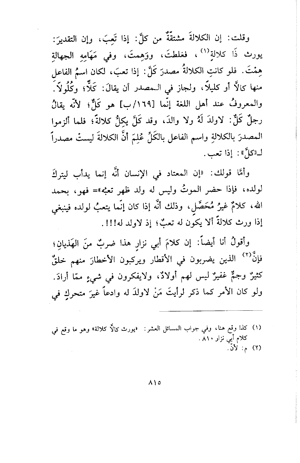 وقلت: إن الكلالة مشتقة من كل: إذا تعب، وإن التقدير: يورث ذا كلالة، فغلطت، ووهمت، وفي مهامه الجهالة همت. فلو كانت الكلالة مصدر كل: إذا تعب، لكان اسم الفاعل منها كالًا أو كليلًا، ولجاز في المصدر أن يقال: كلًا؛ وكلولًا. والمعروف عند أهل اللغة إنما [169/ ب] هو كل؛ لأنه يقال رجل كل: لا ولد له ولا والد، وقد كل يكل كلالة؛ فلما ألزموا المصدر بالكلالة واسم الفاعل بالكل علم أن الكلالة ليست مصدرًا لـ (كل): إذا تعب.
