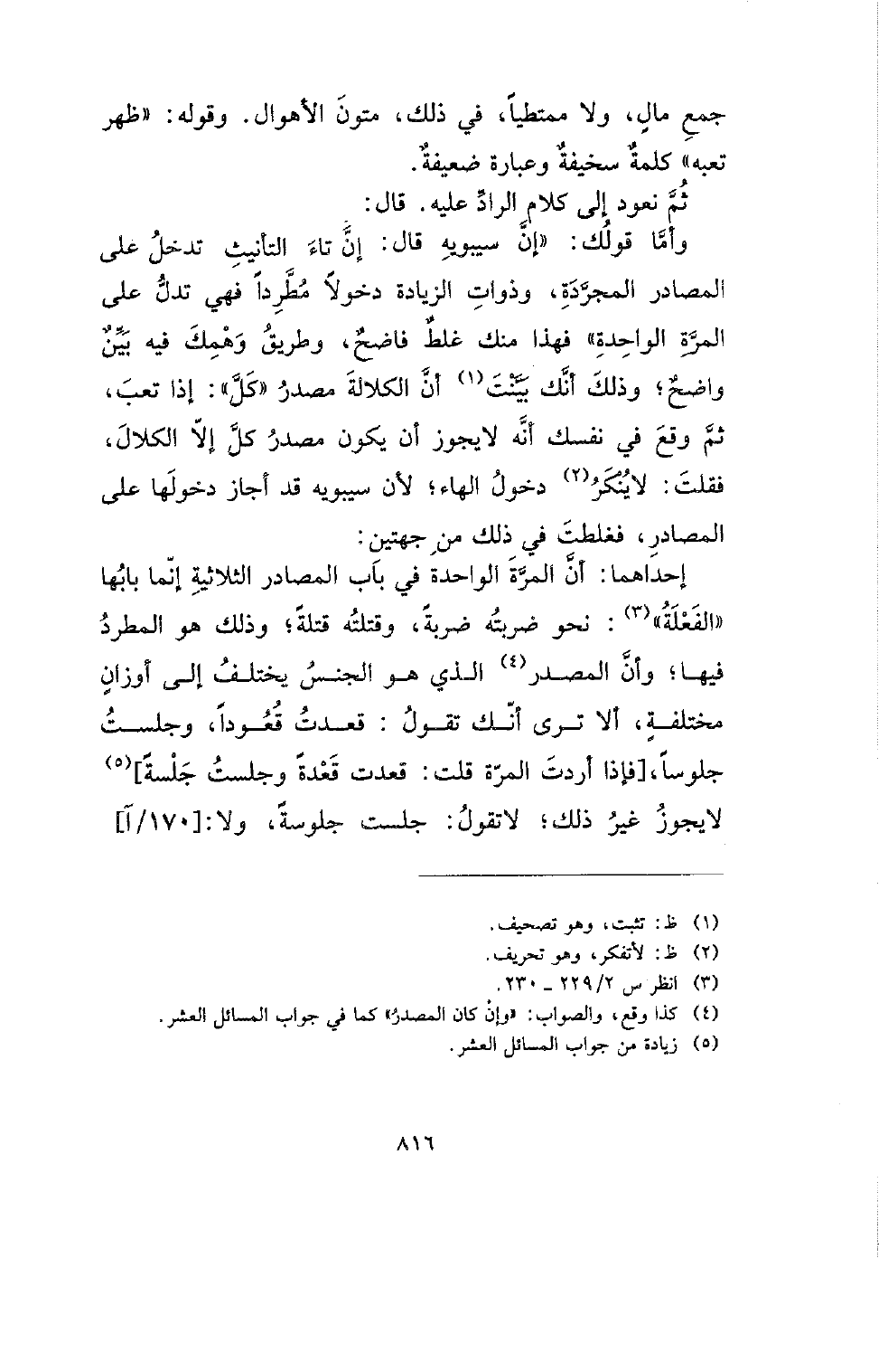 وأما قولك: (إن سيبويه قال: إن تاء التأنيث تدخل على المصادر المجردة، وذوات الزيادة دخولًا مطردًا فهي تدل على المرة الواحدة) فهذا منك غلط فاضح، وطريق وهمك فيه بين واضح؛ وذلك أنك بينت أن الكلالة مصدر (كل): إذا تعب، ثم وقع في نفسك أنه لا يجوز أن يكون مصدر كل إلا الكلال، فقلت: لا ينكر دخول الهاء؛ لأن سيبويه قد أجاز دخولها على المصادر، فغلطت في ذلك من جهتين: