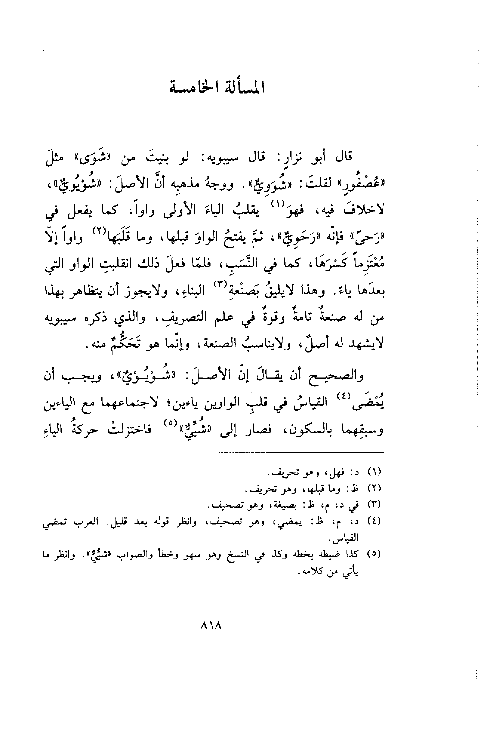 قال أبو نزار: قال سيبويه: لو بنيت من (شوى) مثل (عصفور) لقلت: (شووي). ووجه مذهبه أن الأصل: (شويوي)، لا خلاف فيه، فهو يقلب الياء الأولى واوًا، كما يفعل في (رحى) فإنه (رحوي)، ثم يفتح الواو قبلها، وما قبلها واوًا إلا معتزمًا كسرها، كما في النسب، فلما فعل ذلك انقلبت الواو التي بعدها ياء. وهذا لا يليق بصنعة البناء، ولا يجوز أن يتظاهر بهذا من له صنعة تامة وقوة في علم التصريف، والذي ذكره سيبويه لا يشهد له أصل، ولا يناسب الصنعة، وإنما هو تحكم منه.