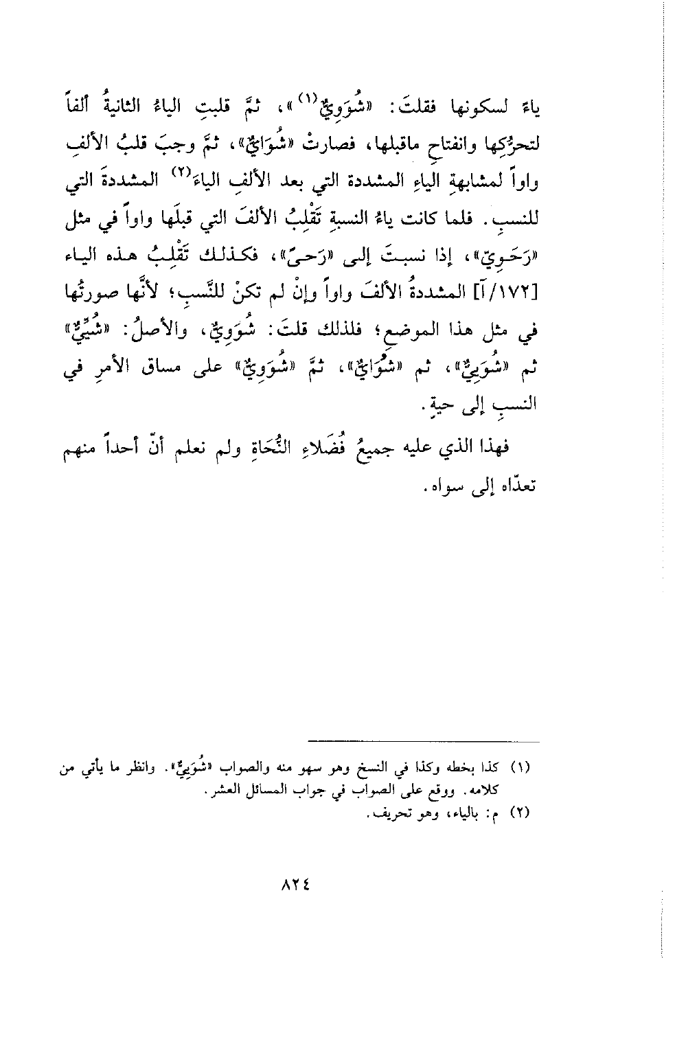 ياءً لسكونها فقلت: (شووي)، ثم قلبت الياء الثانية ألفًا لتحركها وانفتاح ما قبلها، فصارت (شواي)، ثم وجب قلب الألف واوًا لمشابهة الياء المشددة التي بعد الألف الياء المشددة التي للنسب. فلما كانت ياء النسبة تقلب الألف التي قبلها واوًا في مثل " (حوي)، إذا نسبت إلى (رحى)، فكذلك تقلب هذه الياء [172/ آ] المشددة الألف واوًا وإن لم تكن للنسب؛ لأنها صورتها في مثل هذا الموضع؛ فلذلك قلت: شووي، والأصل: (شيي) ثم (شويي)، ثم (شووي) على مساق الأمر في النسب إلى حية.
