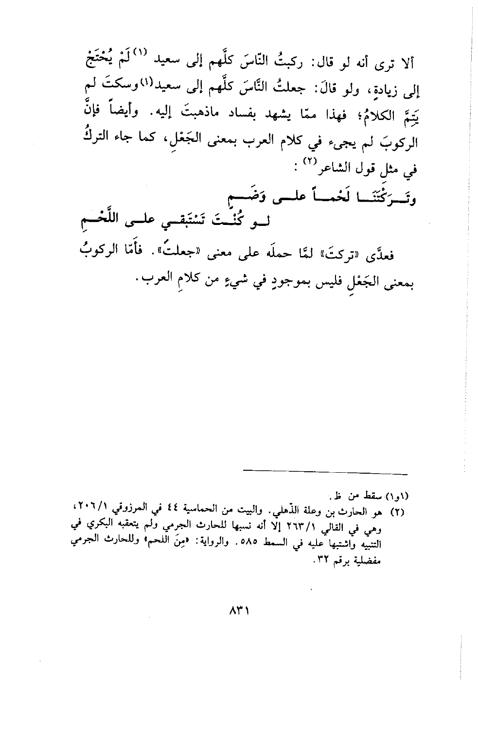 ألا ترى أنه لو قال: ركبت الناس إلى سعيد لم يحتج إلى زيادة، ولو قال: جعلت الناس كلهم إلى سعيد وسكت لم يتم الكلام؛ فهذا مما يشهد بفساد ما ذهبت إليه. وأيضًا فإن الركوب لم يجيء في كلام العرب بمعنى الجعل، كما جاء الترك في مثل قول الشاعر: