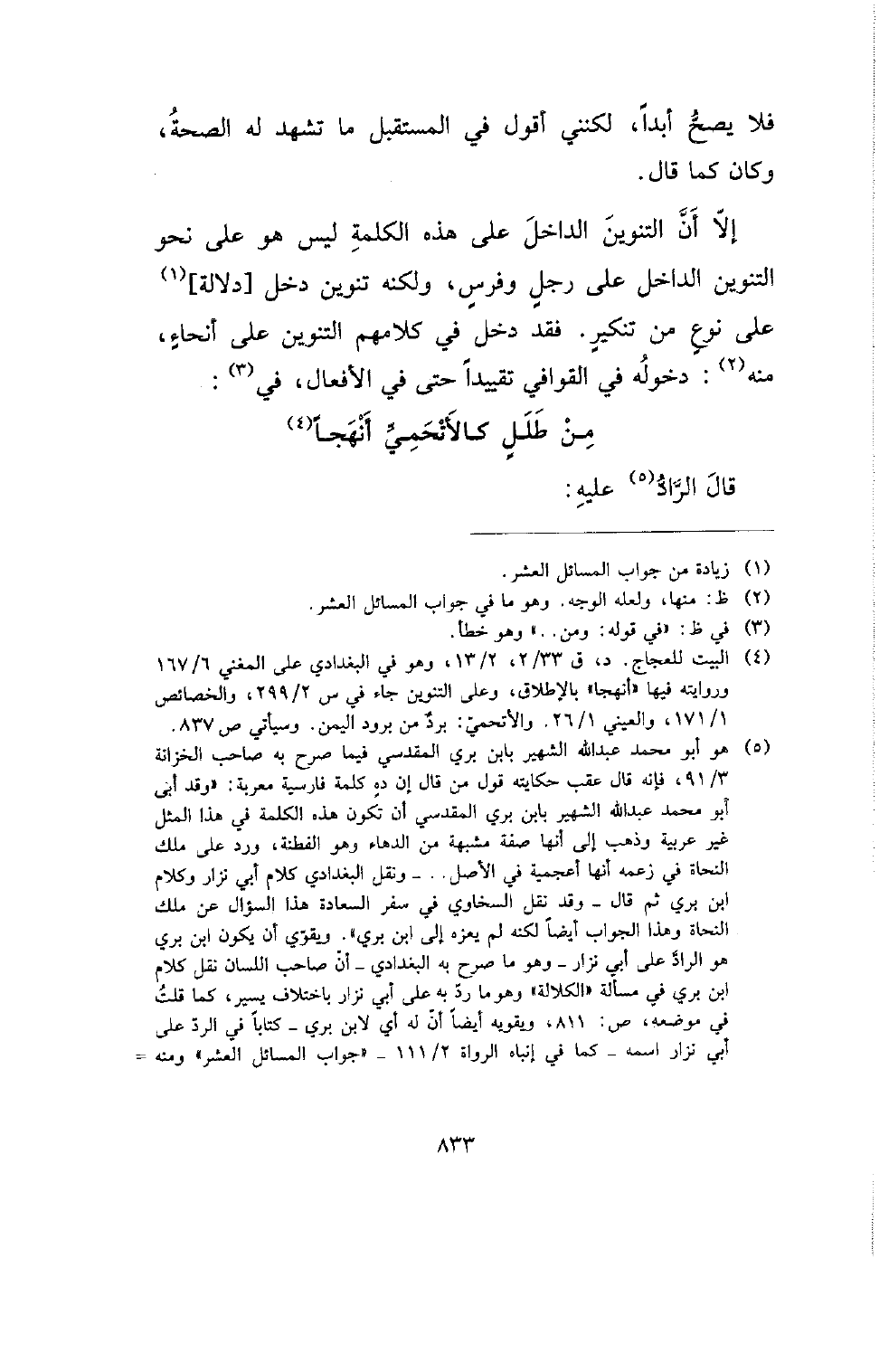 إلا أن التنوين الداخل على هذه الكلمة ليس هو على نحو التنوين الداخل على رجٍل وفرٍس، ولكنه تنوين دخل [دلالة] على نوع من تنكير. فقد دخل في كلامهم التنوين على أنحاٍء، منه: دخوله في القوافي تقييدًا حتى في الأفعال، في: