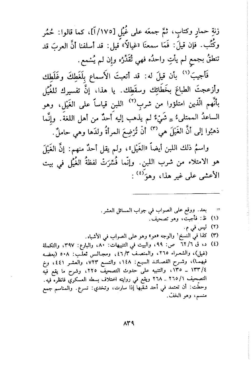 فأجيب بأن قيل له: قد أتعبت الأسماع بلغطك وغلطك وأزعجت الطباع بخطائك وسقطك. يا هذا، إن تفسيرك للغيل بأنهم الذين امتلؤوا من شرب اللبن قياسًا على الغيل، وهو الساعة الممتلئ= شيء لم يذهب إليه أحد من أهل اللغة. وإنما ذهبوا إلى أن الغيل هي أن ترضع المرأة ولدها وهي حامل.