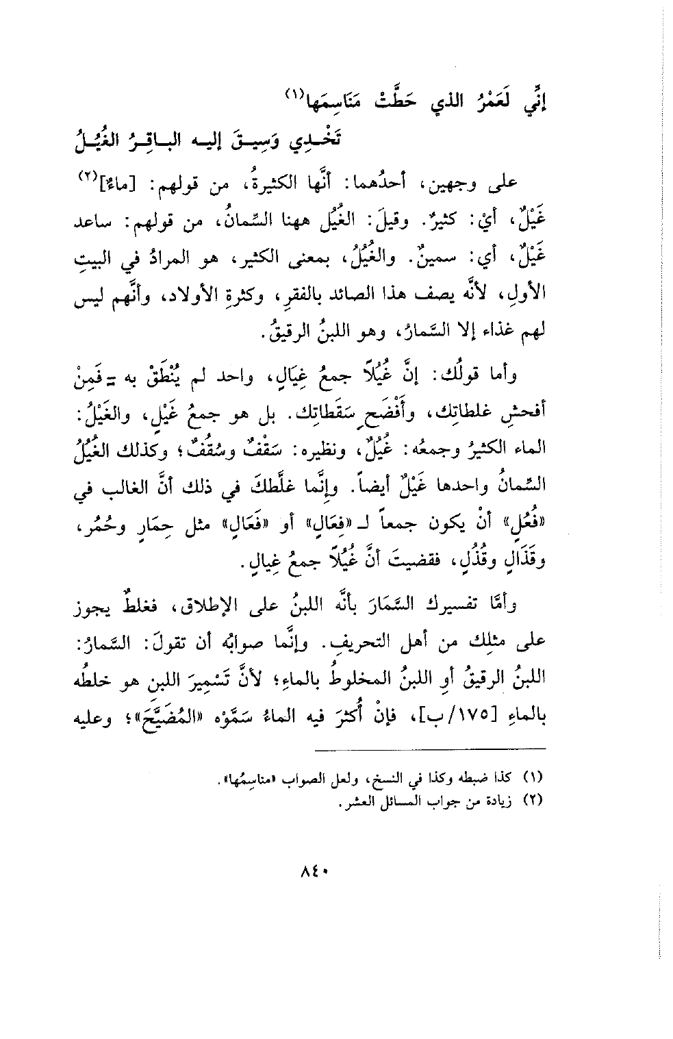 وأما تفسيرك السمار بأنه اللبن على الإطلاق، فغلط يجوز على مثلك من أهل التحريف. وإنما صوابه أن تقول: السمار: اللبن الرقيق أو اللبن المخلوط بالماء؛ لأن تسمير اللبن هو خلطه بالماء [175/ ب]، فإن أكثر فيه الماء سموه (المضيح)؛ وعليه