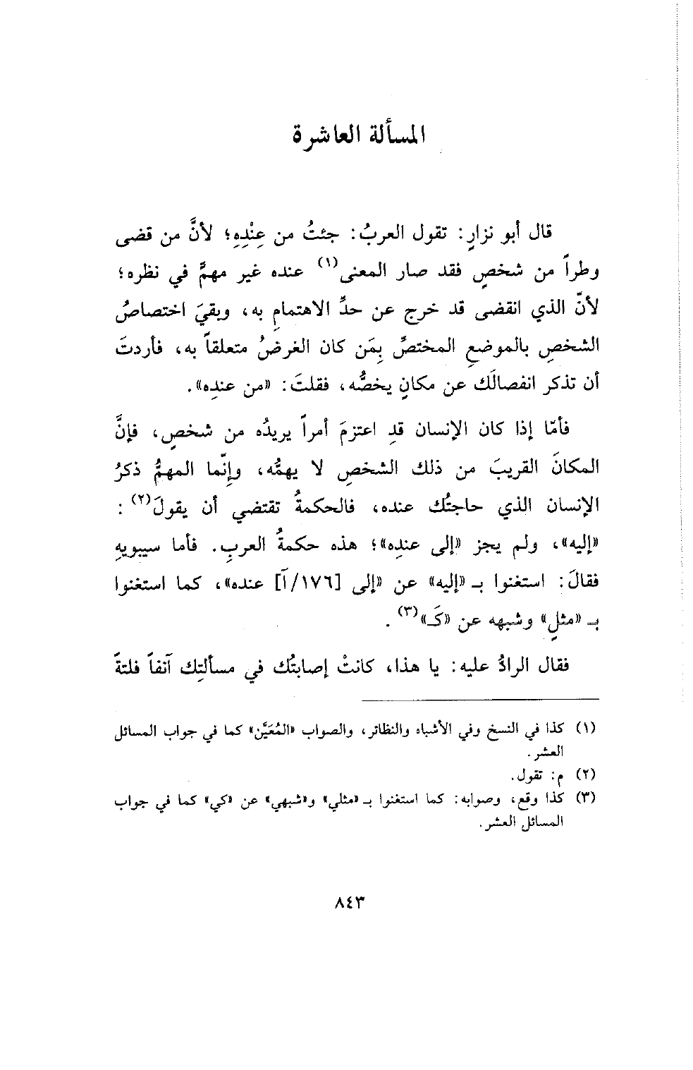 فأما إذا كان الإنسان قد اعتزم أمرًا يريده من شخص، فإن المكان القريب من ذلك الشخص لا يهمه، وإنما المهم ذكر الإنسان الذي حاجتك عنده، فالحكمة تقتضي أن يقول: (إليه)،ولم يجز (إلى عنده)؛ هذه حكمة العرب. فأما سيبويه فقال: استغنوا بـ (إليه) عن (إلى [176/آ] عنده)، كما استغنوا بـ (مثل) وشبهه عن (كـ).